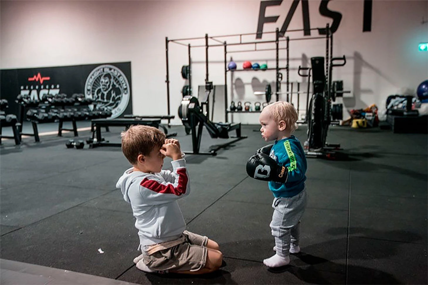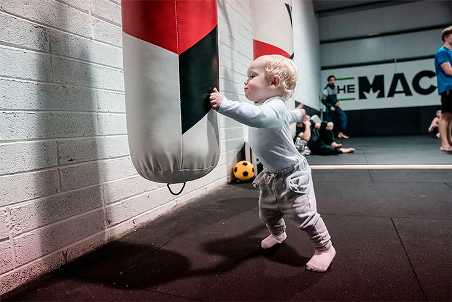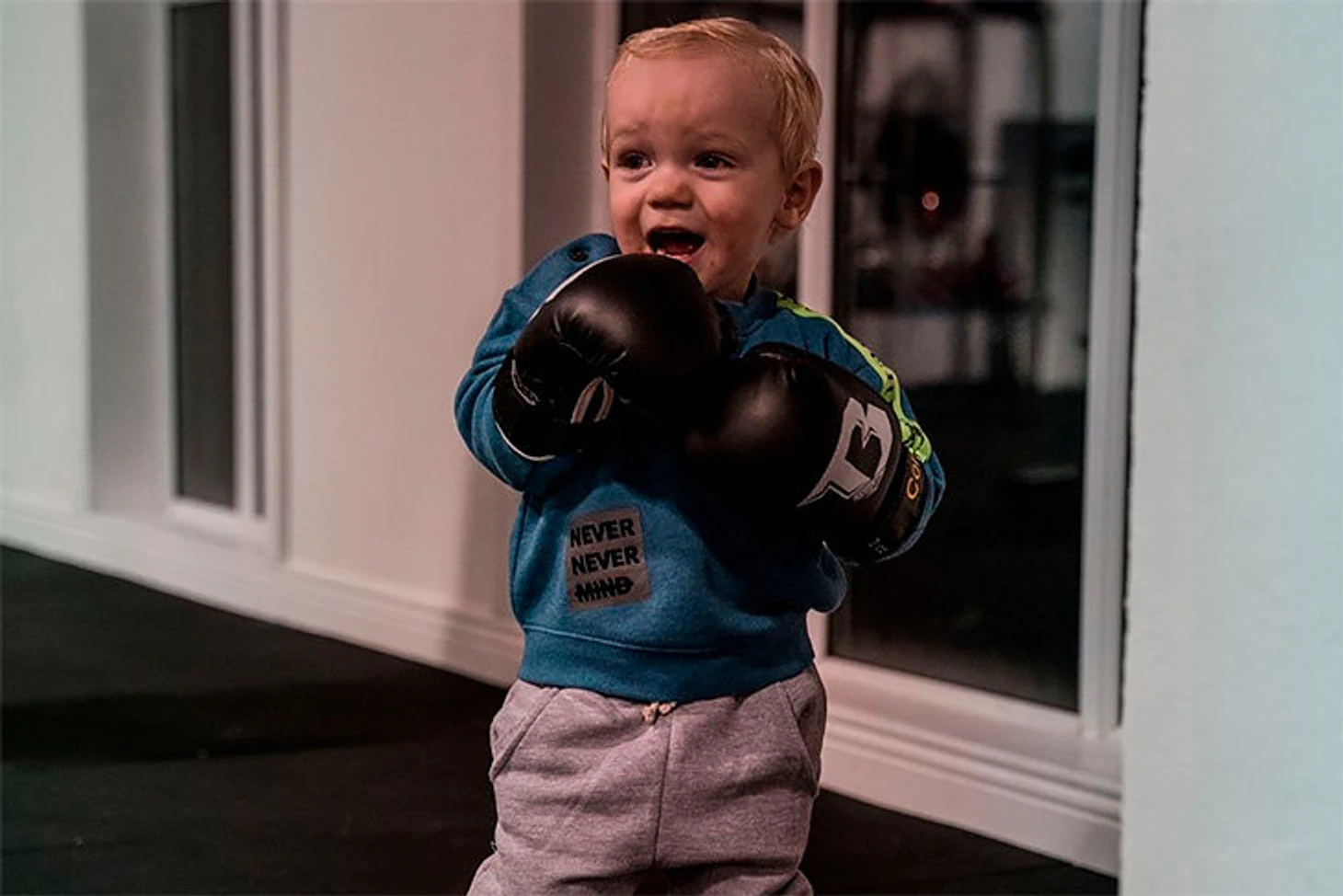 Похоже, малышу нравится тренироваться с отцом: ему даже подобрали маленькие боксерские перчатки, и он уже пытается бить грушу.