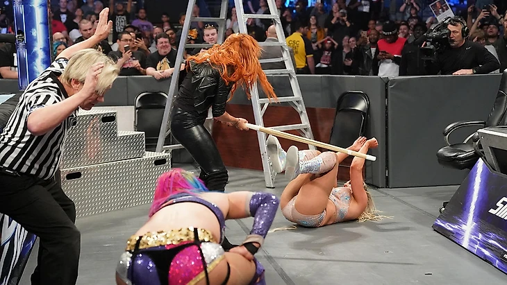 Но после досрочного завершения матча началась настоящая вакханалия, от которой разило скукой и непрофессионализмом. Уже в воскресенье мы будем смотреть шоу под названием Tables, Ladders & Chairs, но вместо этих трёх снарядов девушки лупасят друг друга одинокой палкой кендо. И ладно бы, если бы в этом круговом онанизме было бы хоть какое-нибудь разнообразие. Так нет, палка просто переходила от одной дамы к другой, после чего та принималась дубасить кендо спины своих противниц по грядущему титульнику. И всё это на одном квадрате площади без сдвигов в любое направление. Оператор мог просто стоять на одном месте, потому что женщины даже не думали покидать свою заповедную кендо-зону. Нет сомнений, что на TLC тройной поединок будет потрясающим, но этот сегмент явно не идёт в зачёт рестлершам.