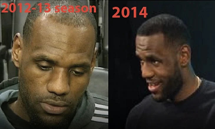 ЛеБрон просто немыслимо набрал в сухих мышцах. Это был танк, который уже никому не сдвинуть. И что самое интересное, волосы начали уменьшатсья ещё быстрее. По возвращению в Кливленд, ЛеБрон сообщил, что в межсезонье сбросил 10 килограмм мышц. Что он будет легче, быстрее, маневренее. Логично предположить, что с возрастом он перестал принимать стеройды. В начале сезона так и было, он стал намного легче.