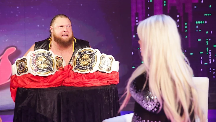 Идём по ниспадающей и на очереди команда "Heavy Machinery", чей дебют получился запоминающимся, но с отрицательным привкусом. Во время дискуссии между Алексой Блисс и Полом Хейманом внезапно на рампу вышел Отис Дозович с улыбкой сексуально озабоченного маньяка, отвисшей губой и капельками слюны, капающей изо рта. Естественно, я утрирую, но начинать карьеру в основе с того, что ты плотоядно пялишься на красивую девушку, тыча в неё пальцем, словно неандерталец, это, мягко говоря, очень спорное решение.