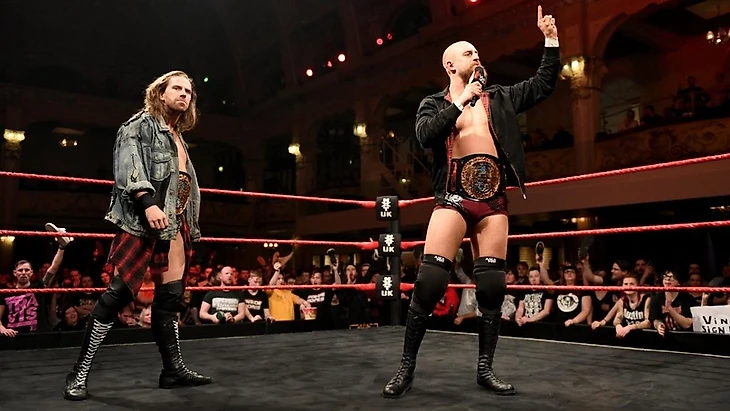 Пока "Бомбер" празднует очередную победу, комментаторы пользуются случаем, чтобы напомнить нам, как британский дивизион WWE обзавелся своими первыми командными чемпионами. Сделанно это было неспроста, так как, опять же, неделей ранее Зак Гибсон и Джеймс Дрейк пообещали высказаться сполна. А послушать вечно недовольного скауза всегда интересно.