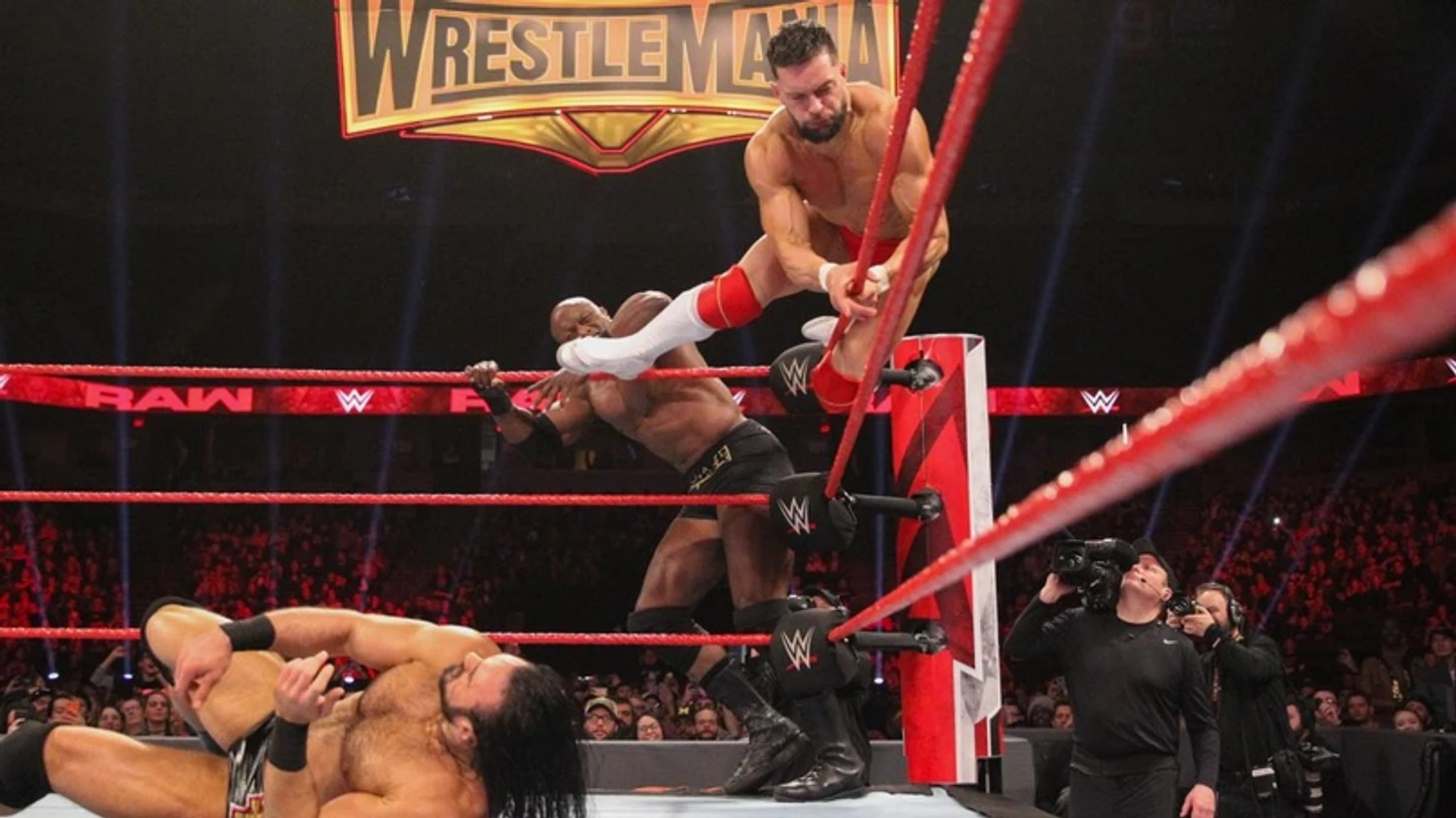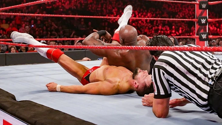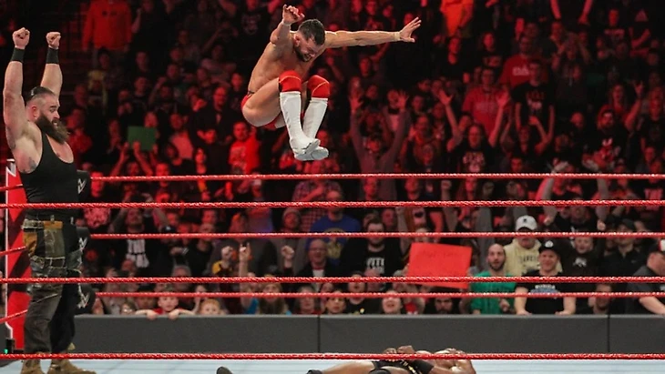 Я не помню, какой раз уже эти парни встречаются в матче, либо одиночном, либо командном, да и какой в нем смысл сегодня, но, что имеем, то имеем. Сразу после гонга Финна отвлекли Лэшли и Лио Раш, что позволило Дрю завладеть преимуществом. И какое-то время он контролировал ход матча, пока не получил дропкик. Затем, правда почти сразу шотландец попытался провести суплекс на рингсайд с апрона — неудачно, а от атаки с апрона Балор ушел, так что, Дрю угодил в стойку ринга. Попытка планчи, но у канатов его вновь зацепил Лио Раш, за что получил дропкик. МакИнтайр попытался атаковать, но получил слингблэйд. шотган дропкик в спину, и Финн уже вышел на Ку де Гра, нео с угла его скинул Лэшли, так что судья дисквалифицировал МакИнтайра. Бобби принялся избивать ирландца, а Дрю стал разбирать ступеньки, но к рингу выбежал Курт Энгл, который раздал здоровякам по немецкому суплексу, а Раша поймал в энкл лок, но со спины его атаковал Бэрон Корбин. Втроем «плохие парни решили избить ветерана, но к рингу двинулся Брон Строумэн. И МакИнтайру и Лэшли досталось от него, а затем и Корбин получил хэдбатт, но «монстр» тут же ответил ему, так что Дрю пришлось спасать «волка» от пауэрслэма.