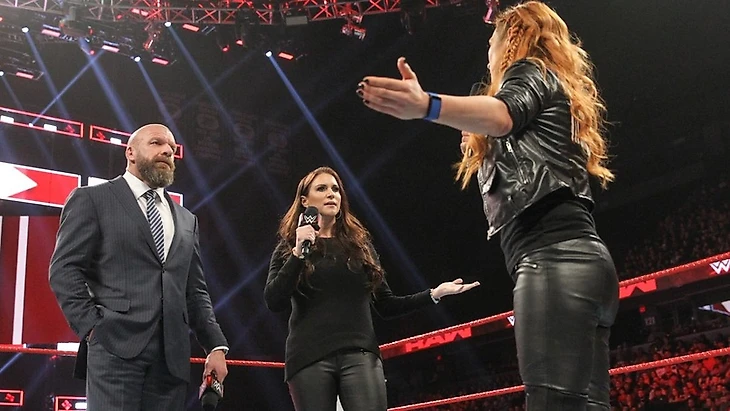 Первой появилась Бекки, затем Трипл Эйч и Стефани, и нам в очередной раз напомнили, что сейчас решается судьба крупнейшего матча, все в таком духе, Трипл Эйч сказал, что они на самом деле хотят, чтобы этот матч состоялся, поэтому они мучают всех нас все шоу ради двух слов, которые являются формальностью. Реакция фанатов была смешанной, но большая их часть все-таки была против, но Хантер посоветовал ей забыть про фанатов, потому что тут должны решать не они, а именно исполнительница. Бекки же заметила, что все еще не верит руководству, фанаты не хотят ее извинений, но, если ее будущее зависит от простых двух слов, то она… сожалеет. «Игрок» предложил рукопожатие, но Бекки заявила, что теперь, когда все формальности улажены, она требует, чтобы больше никто не смел устанавливать препятствия на ее пути к WrestleMania. Трипл Эйч пообещал, что так тому и быть, и Линч, которая с трудом в это верила, но начала-таки обращаться к Ронде, которая тут же вышла к рингу. Но все потенциальные разборки прервал Винс МакМэн. Глава WWE заявил, что ему не нравится поведение Бекки Линч, и ему не по нраву, что она возомнила себя большей фигурой, чем все WWE. Поведение Ронды ему тоже не нравится. На самом деле, это он мужик, а не Линч, и он, как мужик, должен принять сложное решение. Он отстранил Бекки на 60 дней, а значит, ее отстранение закончится через 5 дней после WrestleMania. Ну а заменит Бекки Линч в этом матче следующая чемпионка RAW Шарлотт Флэр. Это объявление и стало жирной точкой в шоу.