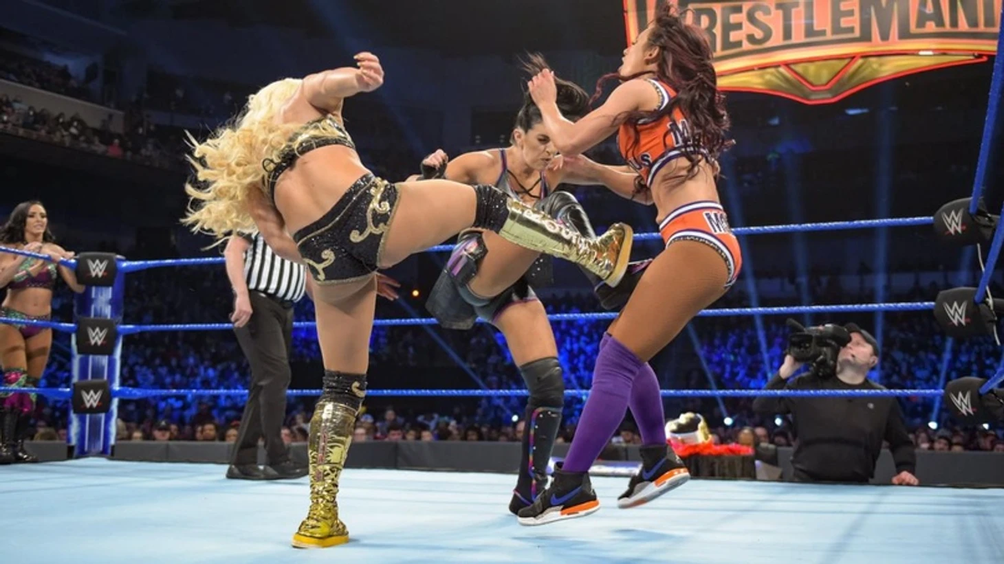 И снова женщины на SmackDown LIVE. Матч начали Мэнди Роуз и Кармелла. Мэнди и Соня нанесли несколько ударов Кармелле, но бывшая чемпионка смогла передать тэг Наоми, которая несколькими киками уложила Девилль на ринг, добив ее красивым прыжком в шпагате. После еще нескольких смен на ринге оказались ненавидящие друг друга Мэнди и Наоми. Мэнди попыталась сменится на ринге с кем-то из Айконикс, однако те благоразумно спрыгнули со своего угла ринга. Все, что оставалось Роуз — так это бежать, но Наоми смогла ее настигнуть с помощью кроссбади за пределы ринга. Во время рекламы произошло еще несколько тэгов, на ринге легальными участницами поединка оказались Соня Девилль и Кармелла, но обе девушки тут же сменились в матче со своими партнершами. Наоми не дала сделать Мэнди ни одного приема, проведя ей фейсбастер и дизастер-кик. Девилль, попытавшись вмешаться в бой, получила суперкик от Кармеллы, Наоми же провела Роуз Split-Legged Moonsault и успешно удержала ее.