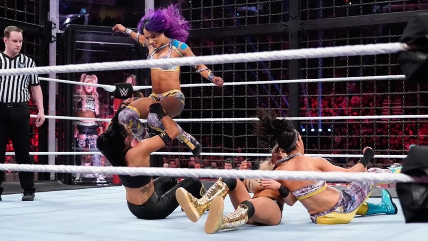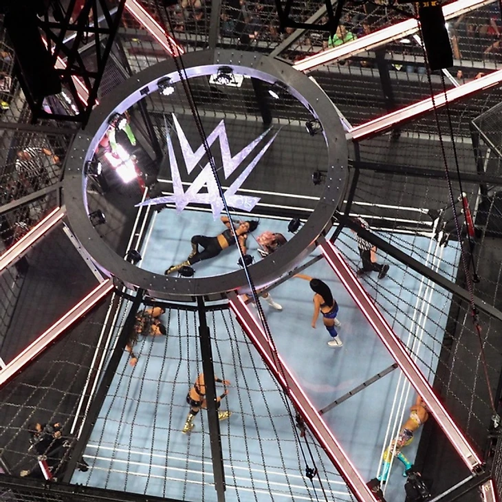 Соня и Мэнди против Саши и Бэйли — таков состав девушек, начинающих матч. Представительницы SmackDown сразу же завладели приемуществом, но Бэйли и Бэнкс достаточно быстро отбились, синхронно проведя слайдинг элбоу (Бэйли) и колени (Саша) оппоненткам, но удержание только до 2. Синхронные станеры у канатов, и Саша с помощью напарницы отправилась в полет своим хай кроссбади на обоих соперниц, но только до 2. Доминация Boss'n' Hig Connection длилась недолго, ибо Соня парировала одну из атак Бэнкс, а затем Мэнди нейтрализовала Бэйли, и доминация продолжилась на рингсайде, под периодический гул толпы. От кика Девилл, однако, «Босс» ушла, так что та ударила по стальной цепи, а Соня зацепилась ногой за эту самую цепь, позволив Бэйли провести бэкбрейкер, а значит самое время для выхода следующей команды, которой стали… Riott Squad. Естественно, более свежие «бунтарки» принялись мучить соперниц, а именно Бэнкс и Бэйли, причем рука первой была травмированна о капсулу, а вторая получила поп-ап хэдбатт от Логан. Fire and Desire же устроили размен с Сарой и Лив. Морган вышла победительницей из схватки с Мэнди, а Соня сумела нейтрализовать Логан, но затем стара получать от Лив, однако, пара атак, и Морган упала без сил. В этот момент в борьбу вернулась Бэйли, получив реакцию толпы и уничтожив всех соперниц, но выход на элбоу дроп не прошел, Соня и Мэнди попытались провести двойной суплекс, а Riott Squad присоединились к этому делу, и мы увидели Tower Of Doom. Далее в матч вышли Пейтон и Билли, которые по очереди попытались удержать каждую участницу матча, но все неудачно. Затем австралийки решили избить всех остальных девушек, что у них, в общем и целом, получилось, Бэйли стала жертвой командной работы, удержание, но Саша пришла на помощь. Естественно, Ройс и Кей, на пару справились с «Боссом», но удержание только до 2. Получали от Пейтон и Билли, в основном, Саша и Бэйли, хотя и остальных вырубать австралийки не забывали (ну а еще они много кричали), но ничего из этого не принесло результаты. Ну а к матчу присоединились Наоми с Кармеллой, и, продолжив традицию, они начали с доминирования, уложив все четыре команды соперниц по углам и раздав каждой по бронкобастеру. Затем Наоми стала разбираться со всеми в ринге, а Кармелаа ушла от попытки пауэрбомбы в исполнении Девилл, направив соперницу харриканраной в стенку. Наоми же провела коронный мунсолт Логан в ринге, удержание, но Лив вовремя спасла соперницу, получив затем кроссбади с угла от Меллы, и буквально все исполнительницы атаковали по очереди всех, и эта серия атак закончилась гарпуном Девилл, который приняла Сара и суперкиком Кармеллы той самой Соне. Соня попыталась свернуть Соню, но попала в Code of Silence, благо Роуз разбила захват, но по душу блондинки пришла Наоми со своим Rear View, но ее сразу же командно свернули The IIconics. После этого, правда, австралийки больно увлеклись празднованием, позволив остальным соперницам прийти в себя, но и те ничего сделать не успели, ибо на ринге появились Тамина с Найей. Понятное дело, в несколько секунд самоанки разбросали всех по рингу и его окружению, а Ройс с Билли Кей сбежали от оппоненток в капсулу… правда, им это не особо помогло, Джэкс с подругой быстро их достали, и познакомили со стенками стальной конструкции. Двойной самоан дроп, синхронное удержание, и Тамина с Найей выбили The IIconics.