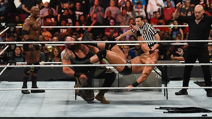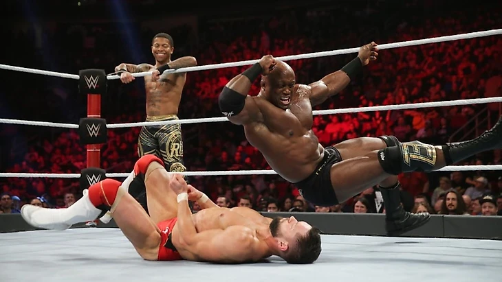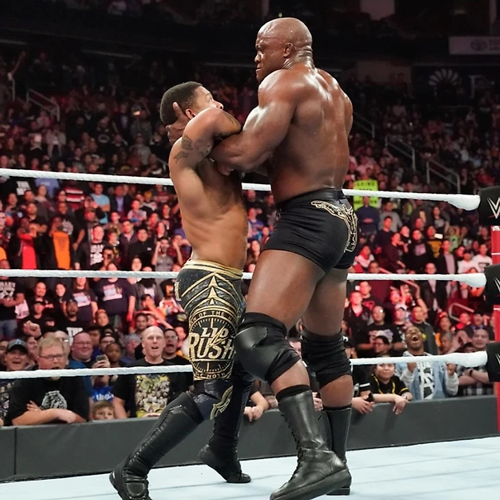 Перед матчем у чемпиона и его напарника взяли интервью, и вопрос заключался в том, что Лио может стать слабым звеном в защищающейся связке, но Лио Раш сделал максимум, чтобы убедить интервьюершу в том, что это у них численное преимущество и вообще «всемогущему» не о чем переживать. Начать матч должны были Финн и Лио, но «хайп-мэн» сразу же передал тэг Бобби. Однако и против Лэшли Балор начал борьбу достаточно бодро, и, отбившись от попыток атак, провел флайинг форарм, который вынудил чемпиона отправиться отдохнуть за пределы ринга. Вернувшись в четырехугольник, Бобби провел мощный бросок и принялся доминировать над соперником, используя свое приемущество в физической силе, но от очередной атаки в углу Финн ушел, провел энзигури с апрона, вышел на Ку де Гра, но Лио отвлек оппонента, и «всемогущий» этим воспользовался. Правда, уже через пару мгновений ирландец отправил Бобби за пределы ринга, собрался полететь на него, но во время отталикивания от канатов Балора зацепил Раш. Естественно, претендент за ним погнался, и Лио привел Финна прямо в объятья Лэшли. Чемпион «познакомил» визави с баррикадой и апроном, и, вернувшись в ринг с ним, передал тэг Рашу. Раш сохранял преимушество, а как только Финн отбился, вернул в матч Бобби. Захват, STO, все это победы не принесло, а в ринг вышел Лио, продолжив тактику болевых. Балор перебросил его через себя, и от очередной попытки атаки MotH ушел в угол, откуда послал в поединок чемпиона. И снова неторопясь принялся Бобби выбивать все силы из претендента, провел слэм и собрался провести гарпун, но тэг у него «украл» Лио, собравшись провести коронный сплэш, но Финн укатился с линии атаки. Балор же пришел в себя, не пустив Лио в угол, а затем одарил его стомпом, и послал Бобби за пределы ринга комбинацией из слингблэйда и клоузлайна. Раш отправился за своим другом, а Балор полетел на соперников планчей. Через мгновение ирландец вернул Лио в ринг и прикончил его комбинацией из шотган дропкика и Ку де Гра. Вот он, чемпион, которого мы заслужили. А главное, Финн получил то, что он заслужил. После боя Бобби Лэшли атаковал своего, видимо, теперь уже бывшего менеджера и ушел недовольный.