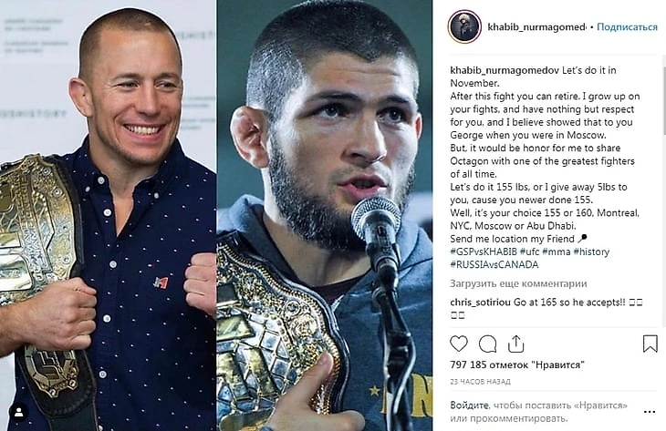 Сен-Пьер ответил, что ценит отношение дагестанца, но «есть решения, которые он нас не зависят». Сегодня Жорж еще раз назвал Хабиба лучшим бойцом мира, а Нурмагомедов в свою очередь пригласил канадца в Россию, чтобы попробовать дагестанскую кухню: «Ведь тебе больше не нужно гонять вес», – написал Хабиб в инстаграме.