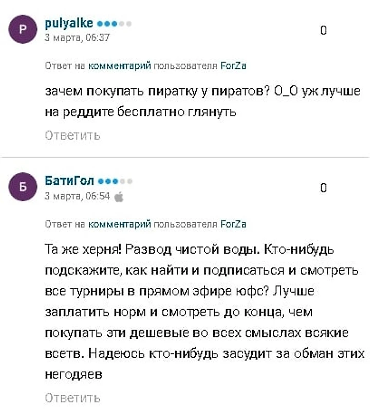На соцсети компании тоже напали с жалобами. В «Ростелекоме» около 9 часов утра (уже после окончания турнира) ответили, что работоспособность сервиса восстановлена, а записи боев доступны в архиве Wink. Многие пользователи требуют вернуть деньги. Компания отвечает на жалобы и готова проводить перерасчет в частном порядке после предъявления чеков об оплате. Зрителям остается только шутить.