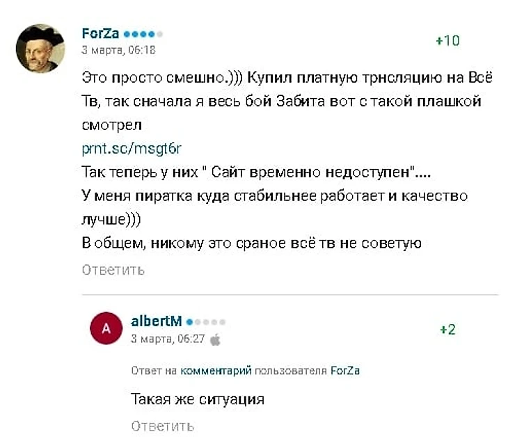 У некоторых картинка вернулась к главным боям, но большинству пришлось искать пиратскую трансляцию по ссылкам в интернете. На «Ростелеком» и Wink жаловались на Sports.ru.