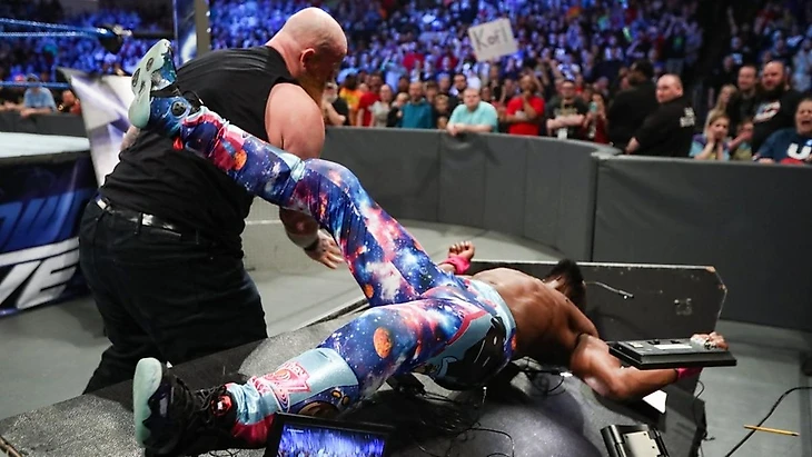 Роуэн выкидывает Кофи за ринг, и словно бронепоезд с разбега влетает в африканца. Далее Роуэн достает стул и бьет им Кофи, что приводит к дисквалификации рыжебородого здоровяка. Но на этом Роуэн не останавливается, и проводит Кингстону бросок на комментаторский стол. Зрители, к которым присоединились ЕС3, Тяжелый Механизм и Никки Кросс, в шоке и в недоумении.