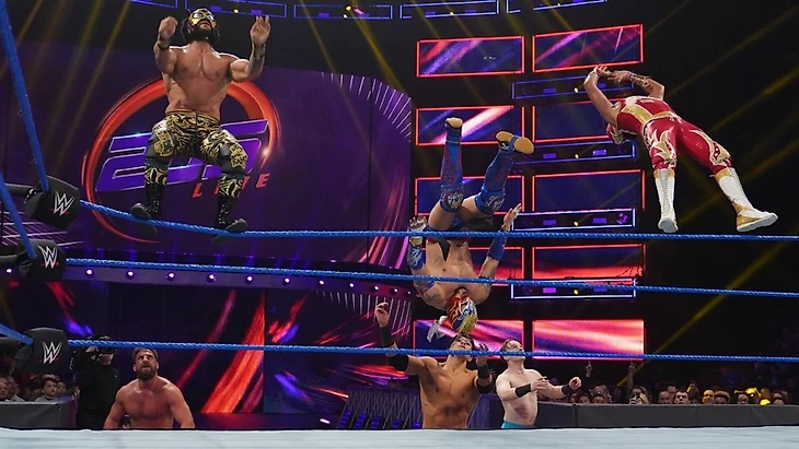 Последний был очень заряжен и атаковал мексиканца springboard seated сэнтоном, springboard corkscrew кроссбади, далее приправил это дело несколькими лоу-киками, Каррийо пытался отбиться - мимо. Далее лидер LHP снова пошёл в наступление через свой Listo Kick и running-харриканраной, удержание - было сорвано Гулаком и Галлахером. Последние попробовали атаковать Калисто двойным бэк-дропом - мимо, так как бывший чемпион США и бывший чемпион 205 Live откинул обоих в сторону своей команды, а те перебросили их через себя и третий канат с ринга. А далее пошла командная работа всех на всех - а именно Калисто атаковал суисайд-дайвом Умберто, а Металик и Дорадо - двойным спрингборд-мунсолтом на Галлахера и Гулака соответственно. Далее пошёл отсчёт для всех на рингсайде и Калисто с Умберто успели зайти на ринг. Лидер LHP приготовился к воздушной атаке, но Каррийо успел пресечь атаку своим хай-киком в ногу лучадора, а после заручился помощью Гулака для проведения двойного суперплекса. Это попытались остановить и Дорадо, и Металик - в итоге Грану удалось слегка ослабить хватку оппонентов, но лишь слегка. И в результате Металик вышел на двойную сансет-флип бомбу, а Умберто и Дрю всё-таки исполнили двойной суперплекс на Калисто. И всё вот это действие прошло одновременно!!! А затем после shooting star press от Дорадо на Гулаке пошла цепная реакция - все кроме Гулака нанесли по одной сильной атаке друг на друге. В итоге снова оказались без чувств и начали постепенно уходить с ринга, в результате остались только Калисто и Каррийо. Первый пытался атаковать последнего, но Умберто отбился и приготовился к возможному мунсолту - а его в это время прервал Гулак. Дрю посчитал, что Умберто очень рискует с этим приёмом, Каррийо принялся утверждать обратное, в итоге бывший Ультимо Ниндзя снова уступил Гулаку. И вот очень зря - этой задержкой в стане оппонентов LHP воспользовался Калисто, который без пыли, но с шумом врезал свой Salida del Sol по Каррийо, успев им также откинуть с апрона Гулака на Галлахера (который хотел после этого прервать удержание, но не успел), и успешно удержал Умберто до 3. Lucha House Party уходят довольными, а Гулак с грустью и Галлахер с фейспалмом в недоумении из-за поражения, хотя Дрю успел вступить в полноценную перепалку с Умберто, а Джек старался сгладить ситуацию.