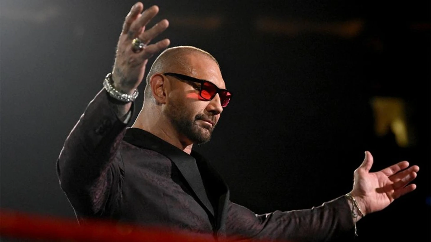 Дэйв Батиста на ринге и нам показывают, как он множество раз бил Трипл Эйча в прошлом. «Поцелуй мой зад»- это все, что сказал Батиста, и он чертовски крут.