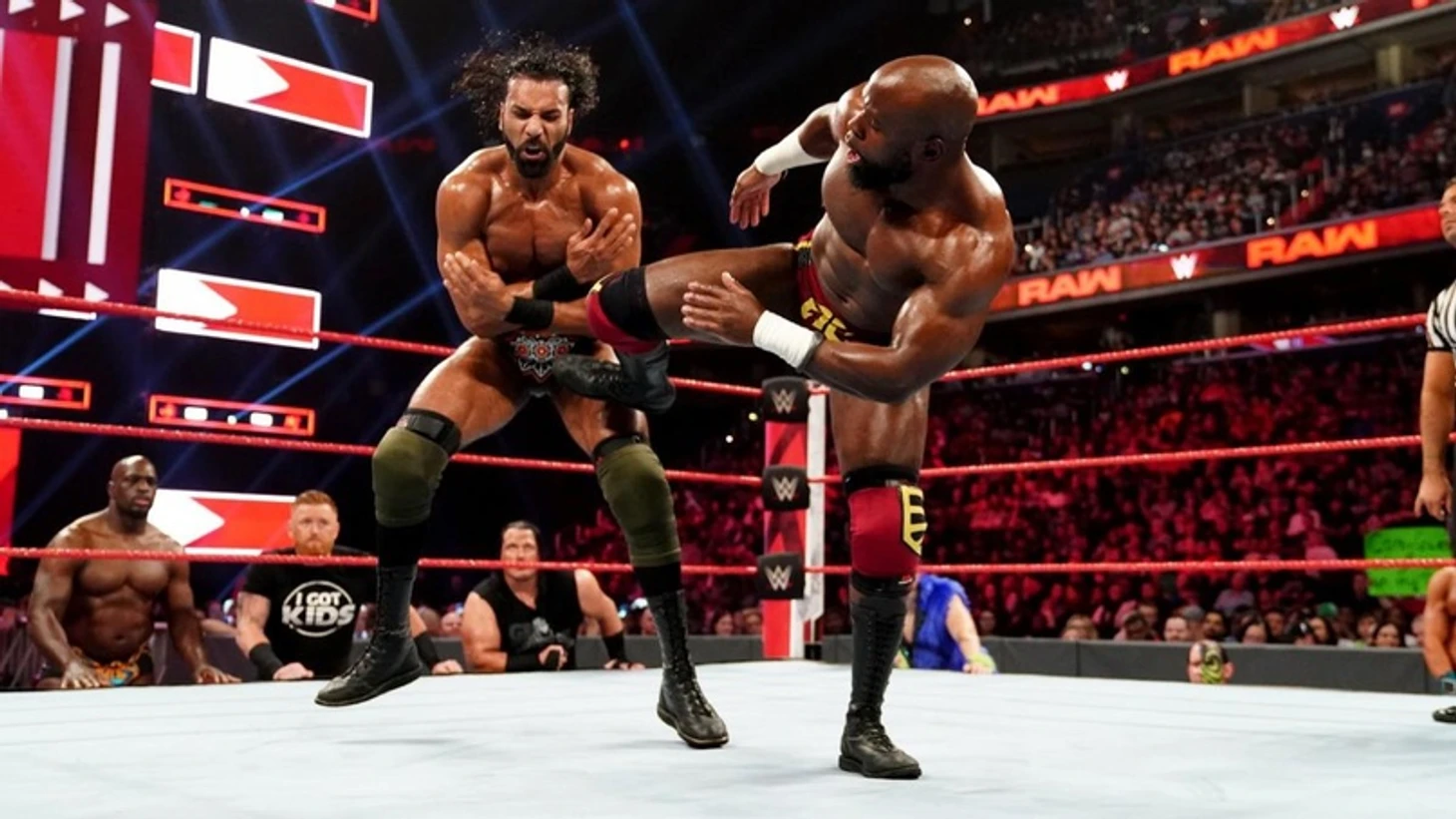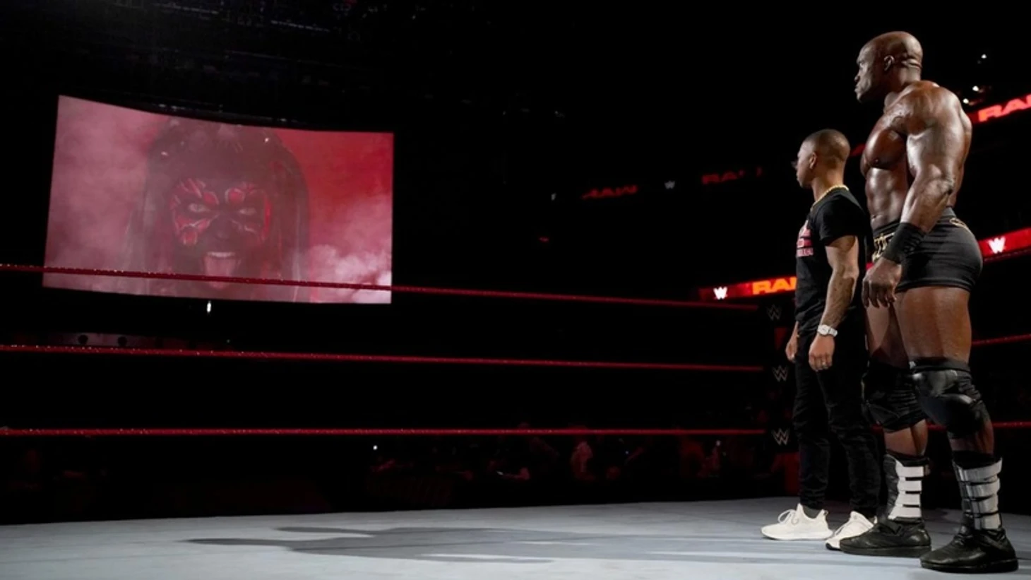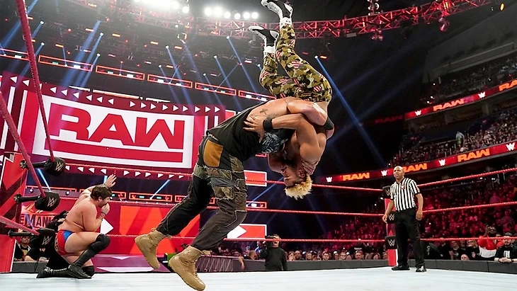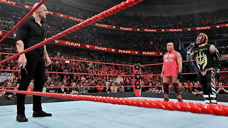 К рингу выходят Бобби Лэшли и Лио Раш. На ринге они ожидали Финна Балора. Но включился титатрон, и мы увидели Демона, который, видимо, съел что-то не то, потому что выворачивало его знатно. Видео исчезло, и чемпион удалился за кулисы.