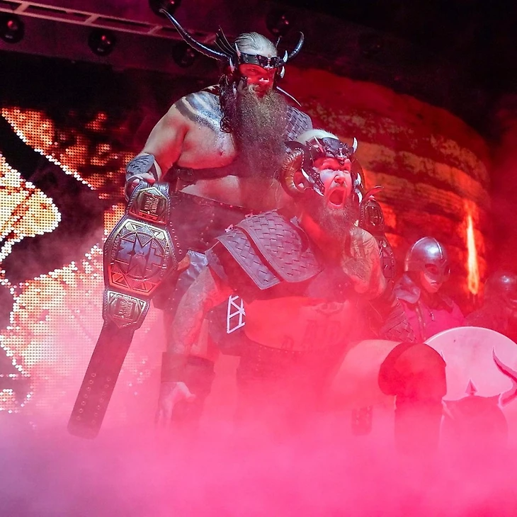 Как и следовало ожидать, восторженные крики заряженной толпы и болтовню комментаторов прерывает стук барабанов и гул боевого рога. На рампе возникают фигуры нордических воинов, а вслед за ними появляются и наши Командные Чемпионы NXT. Это означает лишь одно - "на разогреве" у нас заруба 2-на-2, в которой Современным Викингам будут противостоять победители турнира Dusty Rhodes Tag Team Classic 2019, а по совместительству - одни из главных звезд "желтого" бренда.
