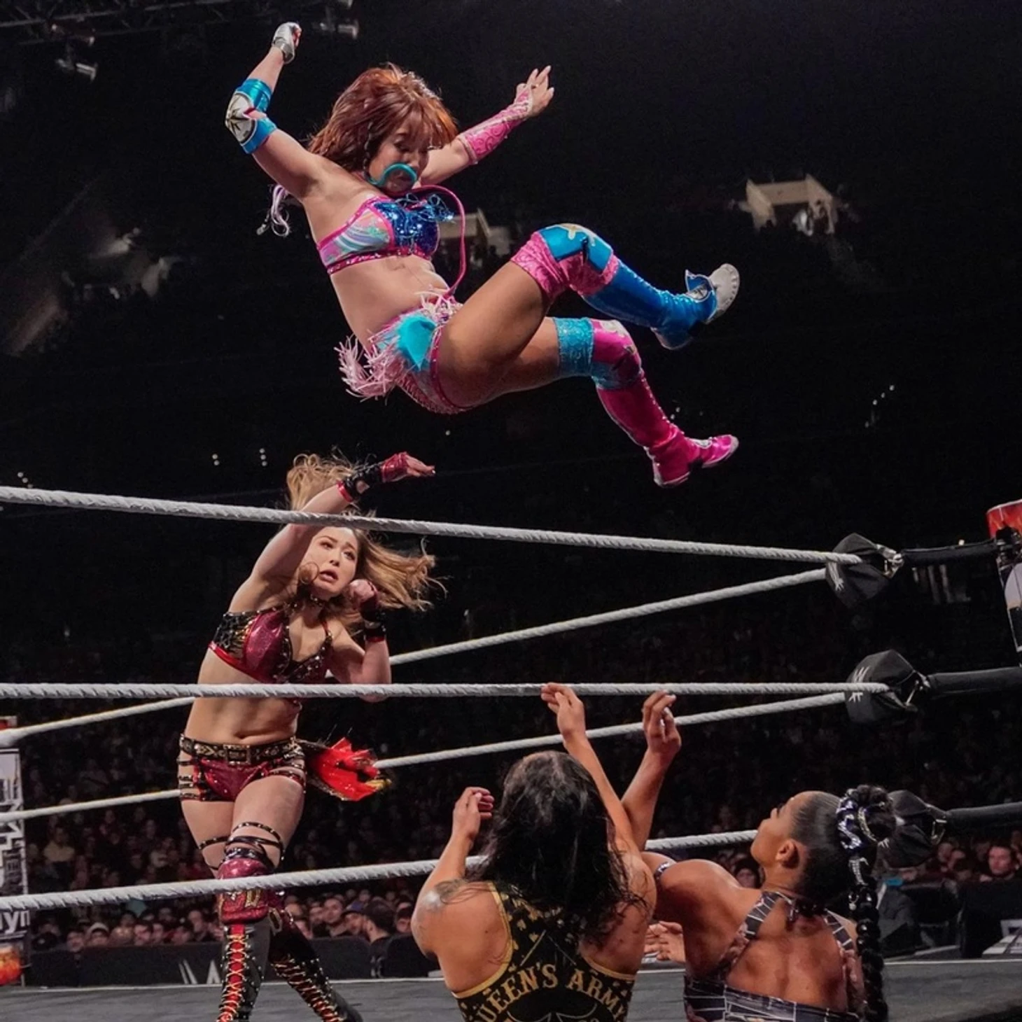Как это зачастую бывает в 4-сторонних матчах, девушки выбрали себе по объекту ненависти и разделились на пары: Шираи против Бэйзлер и Сэйн против Белэйр. Очень скоро плохие девочки избавились от докучавших им азиаток и остались один-на-один. Инициатива переходит то к одной, то к другой, пока Бьянка не провела плечевой блок и не вышла на удержание, которое разбила Ио. Последующий обмен сворачиваниями между Шираи и Белэйр прервала уже Шэйна. Посчитав, что одного кика достаточно для победы, она вышла на удержание, однако тут подоспела Каири. Пока Бэйзлер приходила в себя, между темнокожей спортсменкой и коллаборацией из STARDOM начались игры разума. Совместными усилиями Каири и Ио зачистили ринг, но теперь перед ними встал другой вопрос: пожертвовать ли своей дружбой ради титула? Девушки решились, но не успели причинить друг другу существенного вреда, так как в бой вернулись Шэйна и Бьянка.