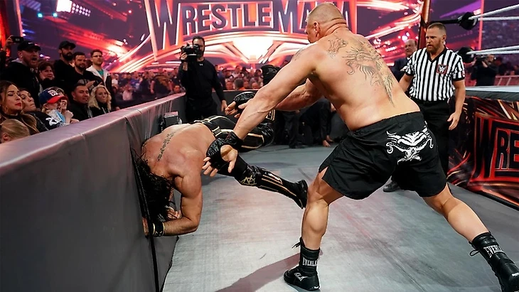 Брок атаковал соперника, когда тот только поднимался в ринг. F5 за пределами ринга. Впечатав Сета головой и в апрон, и в баррикаду, Леснар дважды послал претендента в полет над комментаторским столом, после чего вернул его в ринг... а потом снова вытащил из ринга и снова бросил через комментаторский стол. Затем чемпион установил крышку стола между рингом и самим столом, проведя слэм на эту самую крышку. И снова «Зверь» вернул оппонента в ринг, вернувшись сам в четырехугольник, а судья наконец дал отмашку об официальном начале матча. Немецкий суплекс. Второй. Третий. Попытка F5, но Роллинс соскочил с плеч оппонента и непреднамеренно направил Леснара в судью, который упал за пределы ринга. Удар ниже пояса от Роллинса. Судья стал возвращаться обратно в ринг, а Сет провел суперкик и Блэкаут. Второй. Третий! Удержание, и это победа. У нас новый чемпион Вселенной.