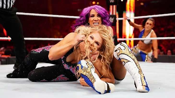 Шарлотт прилетела на арену на вертолете, отдав дань выходу своего отца на American Bash. Для выхода Ронды трек в живую исполнили Joan Jett & the Blackhearts. У Линч же выход был простой, зато костюм необычный и фанаты поддерживали ее громче всех. Начался бой с того, что Бекки попыталась побить Ронду, Ронда ответила, а Шарлотт на все это смотрела со стороны. В итоге досталось и Флэр, и обе Всадницы оказались за пределами ринга, где каждая получила по Piper's Pit: Бекки в баррикаду, а Шарлотт на ринсайд. Ронда зашла на второй бросок Бекки, но та познакомила «Rowdy» с рингпостом, а Флэр затем провела эксплоудер в баррикаду. Шарли и Линч вернулись в ринг, где устроили небольшой размен, а контролем завладела Флэр, даже попыталась Dis-Arm-Her провести, но ирландка ответила сворачиванием и попыткой «Четверки». В этот самый момент в бой вернулась Ронда и провела бросок Бекки, но Шарлотт не позволила ей развить преимущество, а затем представительницы SmackDown попытались провести двойную бомбу за пределы ринга, но Ронда поймала обоих на Сузуки армбар. Линч сумела выбраться из объятий чемпионки RAW, одарив ее низким дропкиком, так что UFCшница жестко упала за пределы ринга. В четырехугольнике же опять развернулась борьбба между бывшими подругами, «Королева» вышла на мунсолт, но Бекки поймала ее в Dis-Arm-Her. Ронда разбила захват, попыталась провести армбар, но получила коленом по лицу от Флэр. Natural Selection обоим оппоненткам от Шарлотт (ботч), попытки удержания обеих, но тщетно. Линч была послана за пределы ринга, а Ронда стала получать чопы, которые, видимо, только разозлили ее и она собралась на одну атаку (и я не понял, что это было) и заключила чемпионку SmackDown в армбар, но захват разбила Линч раннинг бульдогом.