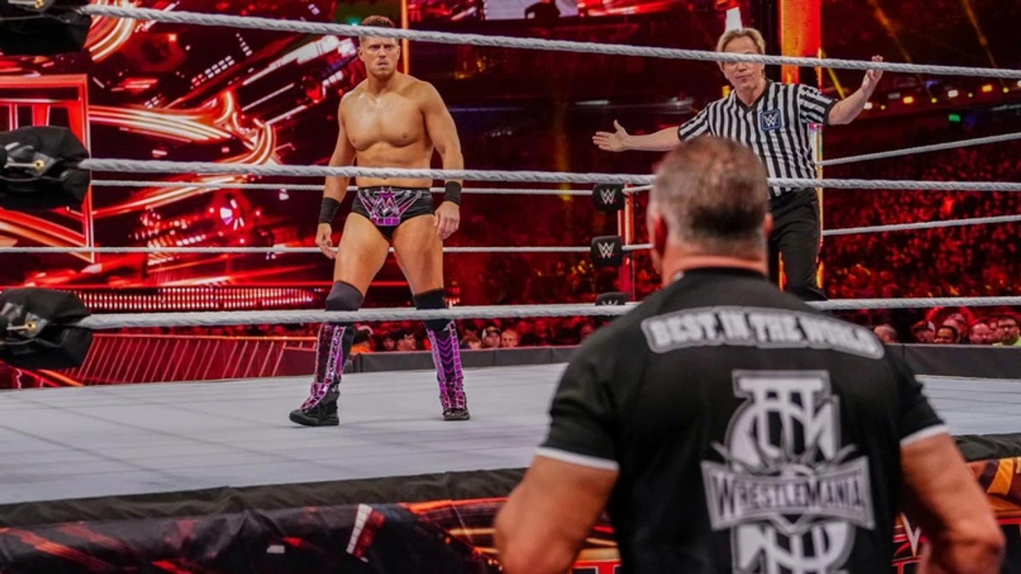 Шэйна представили аж трижды. Отец Миза присутствовал в первом ряду. Сразу после гонга Шэйн сбежал на рингсайд, Миз пустился в погоню, МакМэн чуть-чуть поколотил его по возвращении в ринг, затем снова убежал на рингсайд, докопался до Джорджа (отца Майка), снова стал убегать от разъяренного оппонента, и снова улучил момент для атаки. Миз пытался отбиваться, но О'Мэк сумел завладеть инициативой благодаря своим ударам. Выбросив соперника за пределы ринга, МакМэн разобрал комментаторский стол, уложил на него Миза и забрался на третьй канат для элбоу дропа, но на рингсайд выбежал Джордж, заслонив собой сына. Прыгать Шэйн не стал, а вызвал отц на бой, и Джордж этот вызов принял. Шэйн какое-то время раздумывал, но все-таки атаковал старика, что взбесило Миза, и он бросился избивать бывшего друга сначала в ринге, затем за его пределами, познакомил Шэйна с ограждениями и отправился помогать отцу прийти в себя и вызывать медиков. Потом он все-таки вернулся к атакам, полетев на МакМэна через баррикаду, драка продолжилась в зрительском зале, и преимуществом владел Майк, но Skull Crushing Finale Шэйн избежал, впечатав оппонента в столб, а затем прошел DDT, но только до 2. Затем Миз отбился, сумел сбросить соперника с постамента, на котором они дрались до этого с помощью импровизированного дропкика, и принялся обрабатывать Шэйна стулом. Майк продолжил загонять своего соперника все дальше, борцы добрались до столов иностранных комментаторов, обрушил на соперника несколько столов, параллельно впечатывая «Лучшего в мире» в стальные ограждения. Слэм на один из столов, который развалился надвое, удержание, но только до 2. Удар монитором по лицу О'Мэка, и тот улетел через ограждение прямо на ящик с оборудованием и дальше на цементный пол, но удержание опять только до 2. По ходу действа рестлеры добрались еще до какого-то постамента, Skull Crushing Finale прошел, но Шэйн вырвался из удержания, как будто он не Шэйн МакМэн, а Роман Рейнс. Майк продолжил доминирования, но МакМэн отбился каким-то ящиком и стал забираться куда-то на верх, где стоял один из комментаторов, Миз пустился в догонку, и, в итоге, оба рестлера стояли на самом верху, только Шэйн стоял спиной к пропасти. Естественно, он стал просить прощения, и, естественно, Миз его не простил. Суперплекс с верхотуры вниз, но упали рестлеры так, что Шэйн оказался лежащим на своем сопернике, и судья отсчитал удержение. Шэйн МакМэн победил