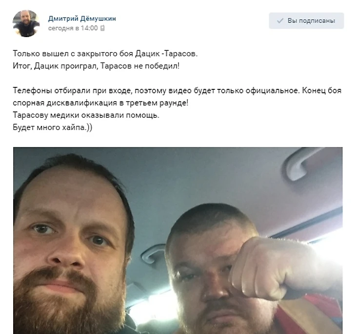 «Рыжий Тарзан» уже сделал несколько спойлеров перед боем. Например, Вячеслав заявил, что его противник предлагал ему 500 тысяч рублей за поражение, от чего «сын Сварога» отказался. Хотя,в итоге бой он проиграл бесплатно, по крайней мере, как пишут зрители поединка. Среди последних был Дмитрий Демушкин, русский националист, известный еще и своим знакомством с одним из сегодняшних героев.