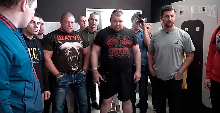 В зале было несколько десятков людей, среди которых президент Fight Nights Global Камил Гаджиев, бойцы Владимир Минеев и Виталий Минаков, а также обладатель абсолютного рекорда в жиме лежа без экипировки Кирилл Сарычев.