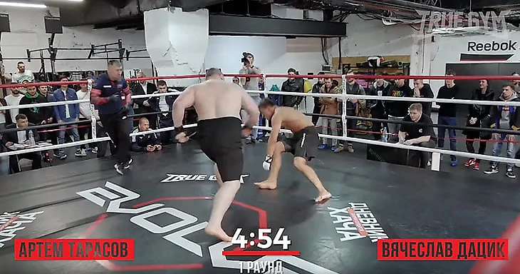 Оба бойца померли к концу раунда. Примерно так же прошла вторая пятиминутка, в которой Дацик несколько раз клал локоть на голову Тарасова, но не уничтожал, а просто бездействовал. В конце сверху оказался уже Артем – и Дацику наприлетало.