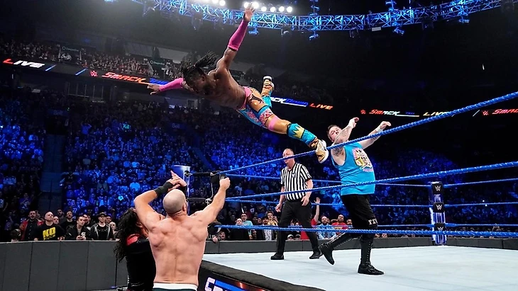 Матч начинают Ксавье Вудс и Русев. Болгарин пытается зажать Вудса в угол, Ксавье различными способами этого избегает. Русеву все-таки удается провести несколько ударов плечом по Ксавье. Тромбонист отвечает клоузлайном, но удержание не удалось. Кофи и Ксавье проводят двойной бульдог, Русев опять вырывается из удержания. Болгарин меняется на ринге с Накамурой, японцу удается атаковать Кофи первым, но вскоре чемпион стомпами кладет Шинске на ринг. Кингстон отправляет Короля Жесткого Стиля в свой угол, и все трое проводят знаменитую атаку ногами в лежащего в углу оппонента. Далее Оуэнс при помощи Вудса исполняет на японце кэннон-болл, однако Ксавье не удалось сохранить инициативу Нового Дня, так как Накамура хил-киком сбивает его с ног и отдает тэг Сезаро. Швейцарец и Ксавье обмениваются ударами, далее Вудса отвлекает Русев, и Сезаро выкидывает бывшего командного чемпиона из четырехугольника. Там его поджидает Накамура, который бросает тромбониста лицом вниз в баррикаду.