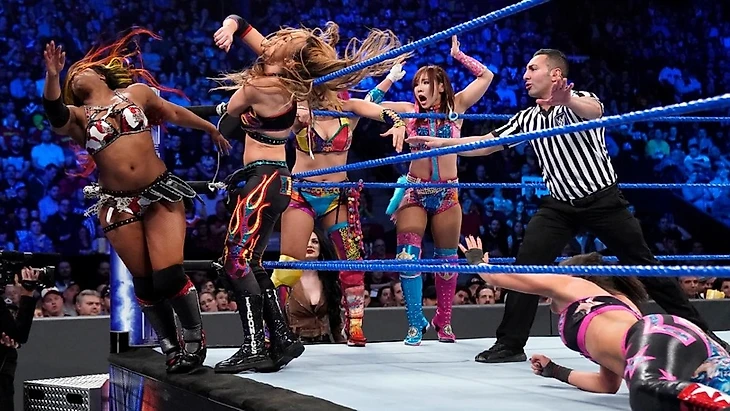 Матч начинают Билли Кей и Эмбер Мун. Мун проводит красивую хуррикенрану, Билли тут же передает тэг своей со-команднице Пейтон Ройс. Эмбер разгоняется для следующей атаки, но ее тэгает Бэйли. Хаггер проводит удар локтем. Доминацию своей команды Бэйли сохранить не удалось, Пейтон удается смениться на ринге с Соней Девилль. Соня атакует Бэйли ударами в корпус, но довольно быстро новичок SmackDown смогла отбиться и провести бэк-элбоу. Бэйли передает тэг Аске, японка вместе с Соней пытаются попасть друг в друга ногами, но кики обеих участниц идут в воздух. Аска пытается выпустить на ринг Каири Сейн, но отвлекается и пропускает удар от Девилль. Соня дает тэг Мэнди, Аска уворачивается от броска Роуз и проводит ей хип-эттак. Аска, наконец, дотягивается до Каири, и обе японки демонстрируют хорошую командную работу с помощью киков и бульдогов. На помощь Мэнди выходит Соня, которая натыкается на локоть Бэйли. Обе участницы Абсолюшн находятся за рингом, Бэйли отправляется за ними суицидальным прыжком. Австралийки пытаются помочь своим партнершам, но все четверо получают кроссбади от Эмбер Мун.