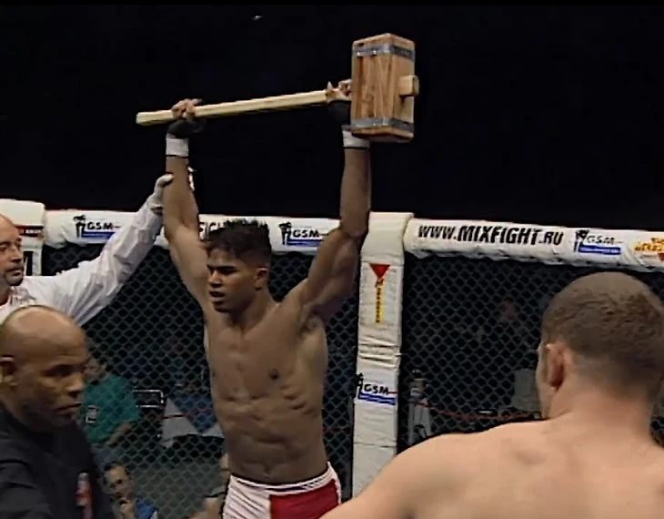 После поединка в клетку вынесли любимую кувалду Оверима.