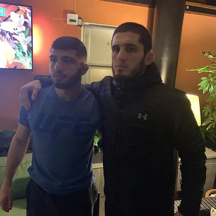 Арман сидел на минус первом этаже и обедал со своим тренером. К нему подошел Махачев, спортсмены тепло обменялись фразами и сфотографировались.