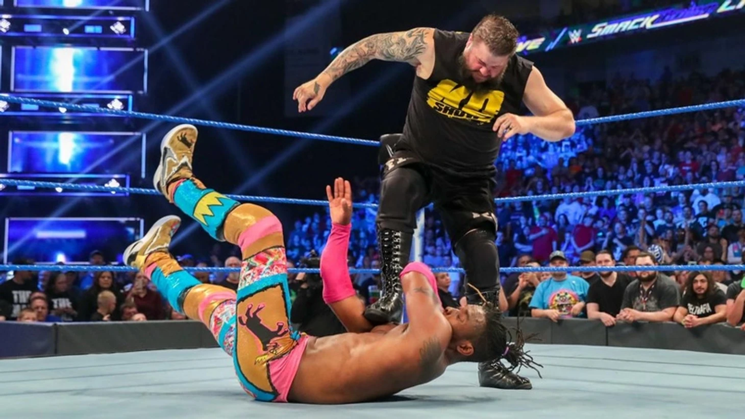 На помощь к другу со своего собственного комментаторского стола выбегают Биг О и Ксавье Вудс. Вудс с помощью Оуэнса устраняет Русева своим флипом, но сразу получает Киншасу. Шинске пытается атаковать Кевина, но того отталкивает Кофи, который наносит своему сегодняшнему оппоненту Трабл ин Пэрадайс. И тут внезапно Кевин Оуэнс проводит суперкик Кингстону! К.О. избивает Кофи на ринге и за его пределами, хватает титул, и кричит что он придет за ним. Чемпион находит в себе второе дыхание чтобы отбиться, но ненадолго. Оуэнс выкидывает Кофи за ринг, пытается провести пауэрбомбу на апрон, но друга спасает Ксавье Вудс. Однако это была медвежья услуга, ведь сам Вудс и получил пауэрбомбу на апрон.