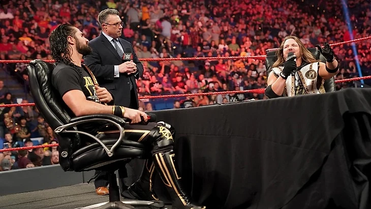 Ему пришлось превзойти себя, но не слишком ли он был поглощён желанием доказать, что он рабочая лошадка, которая пашет не зря? Как Сет держится после этого? Фанаты зачантили «Burn it down!», на что ЭйДжей сказал, что они могут сколько угодно сжигать до тла, но Стайлз в итоге отстроит все заново. Также ЭйДжей выразил обеспокоенность тем, что от команды, от братства, в котором состоял Роллинс, ничего не осталось, никто теперь не окажет ему поддержку, не приободрит его. Он не думает, что у Сета осталось много пороха в пороховницах. И на Money In the Bank он будет бульдогом, который должется нужного момента, вгрызается в чемпиона и будет трепать его, пока не отберёт у «Архитектора» блестяшку. После этих слов претендент подписал контракт. Сет сказал, что на самом деле, их истории успеха со Стайлзом могут быть похожи, однако, есть существенная разница. Ведь Роллинс сделал то, что так и не далось ЭйДжею. Он победил Брока Леснара. Как он держится? Лучше спросить об этом Брока, которого Роллинс победил, потому что был лучшей версией себя. И на грядущем PPV он также будет лучшем собой. Тут и чемпион поставил свою подпись на документ. Майкл Коул стал покидать ринг, а Стайлз схватил титул и внимательно посмотрел на него... После чего вернул трофей его обладателю. После этого он собрался покидать ринг... Но внезапно атаковал Сета. Роллинс же отбился и провел суисайд дайв Стайлзу, вернувшись после этого в ринг и предложив продолжить бой. ЭйДжей поднялся на апрон, одарил Сера ударом предплечья и завершил все это дело Феноменальным локтем прям на стол. Конец.