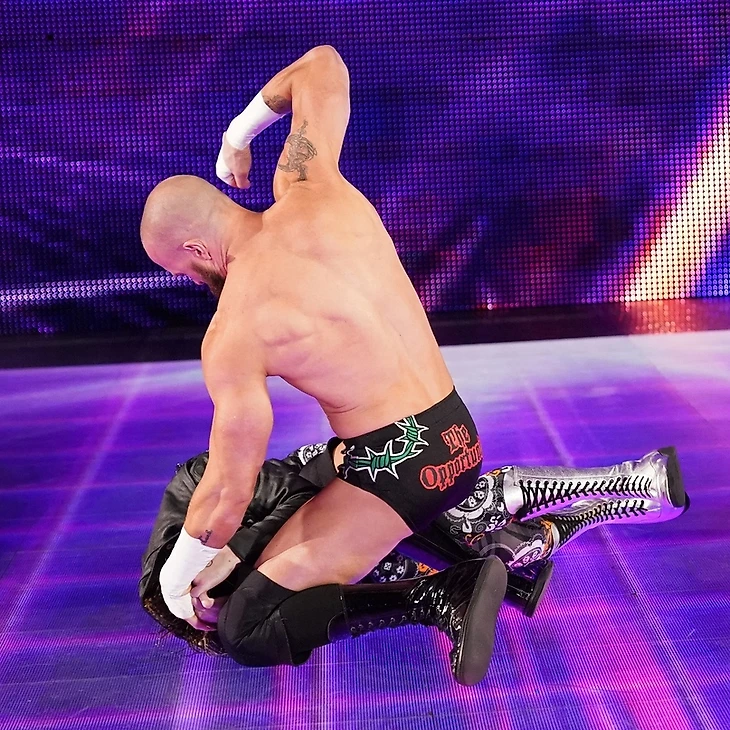 Начали рестлеры бой размеренным лок-апом, хотя и не постеснялись на старте слегка пошуметь - чемпион вломил арм-драгом по Гулаку, чтобы угомонить его - Дрю ответил забавным захватом за бороду Тони. После пытался фиксануть ножницы, но Низ вовремя разбил захват, а пока исполнители вновь решались на новый заход, нам показали Арию Дайвари, следящего за матчем - надо же было оценить способности своего оппонента. А Тони и Дрю тем временем пытались перехитрить друг друга - что в новом силовом чейне, что в серии сворачиваний и перехватов. После гляделок между собой рестлеры решились на активную фазу - Дрю атаковал чопом в одном углу, загнав туда чемпиона, но уже в другом углу промахнулся, а Низ с помощью удара с локтя и обманного мунсолта поймал Гулака на кик в корпус и комбинацию Rapid Strike - удержание было сорвано с 1. Дрю удалось сразу уйти с ринга, чтобы перегруппироваться, однако чемпион бренда сразу пошёл за ним, дезориентировал его и влепил свой elbow-страйк. Только вот с возвращением на ринг Гулака своими руками у Низа не получилось - Дрю тут же выкатился обратно на рингсайд, а Тони решил более не церемониться и атаковал по новой moonsault-планчей - удержание после полного возвращения на ринг не прошло. Тони начал вновь показывать свой контроль парой чопов на Дрю, только вот Гулак снова решил пофилонить и даже попытаться уйти с рингсайда - но это всё оказалось манёвром для дезориентации чемпиона. И это сработало - хоть удержание от Дрю и не прошло, зато Дрю получил шанс на перехват инициативы. И принялся показывать свой стиль борьбы - взял в болевой левую руку Низа и казалось, что взял крепко, но Тони удалось найти выход из положения, и он начал бить Гулака в голову ногой. А после освобождения из захвата, рестлеры разогнались по рингу с целью зацепить друг друга - победил именно чемпион 205 Live, отвесив коронный The Running Kneese - но удержание только до 2. Тони решился на новый заход с коронным коленом - и снова Дрю вовремя ушёл с линии атаки, тем самым заставив Низа снова последовать за ним. Там оба сцепились между собой в опасном отрезке борьбы на апроне, которая окончилась bodyslam-ом от Дрю на чемпионе и именно на апрон - удержание только до 2. "Лучший сабмишен-мастер" всё-таки решил начать действовать прямо и в своём стиле - стараясь сломить чемпиона, а для начала провёл ему fireman's carry-гатбастер, но поспешил с удержанием - которое не прошло. Это и стоило Дрю возможность для потери контроля, так как Низ начал сопротивляться несмотря на напор от Гулака - так, к примеру, Тони переборол натиск Дрю и отвесил ему в углу свой rolling throat-thrust-панч, а следом и франкенштайнер с третьего каната.