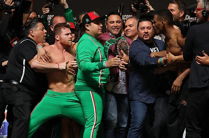Американские журналисты пишут, что у Дэниэла Джейкобса была очень сложная весогонка – Альварес справился гораздо легче. В пятницу ночью Джейкобс еле-еле уложился в лимит среднего веса. Но самое интересное началось после того, как бойцы сошли с весов. На финальном стердауне Канело и Дэнни сблизились слишком сильно и начали бодаться. Альваресу не понравилось, что соперник слишком сильно давит лбом и немножко распустил руки. Развязаться драке не дали секьюрити и представители боксеров – разнимал даже Де Ла Хойя.
