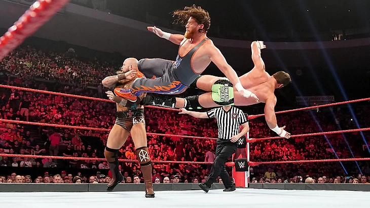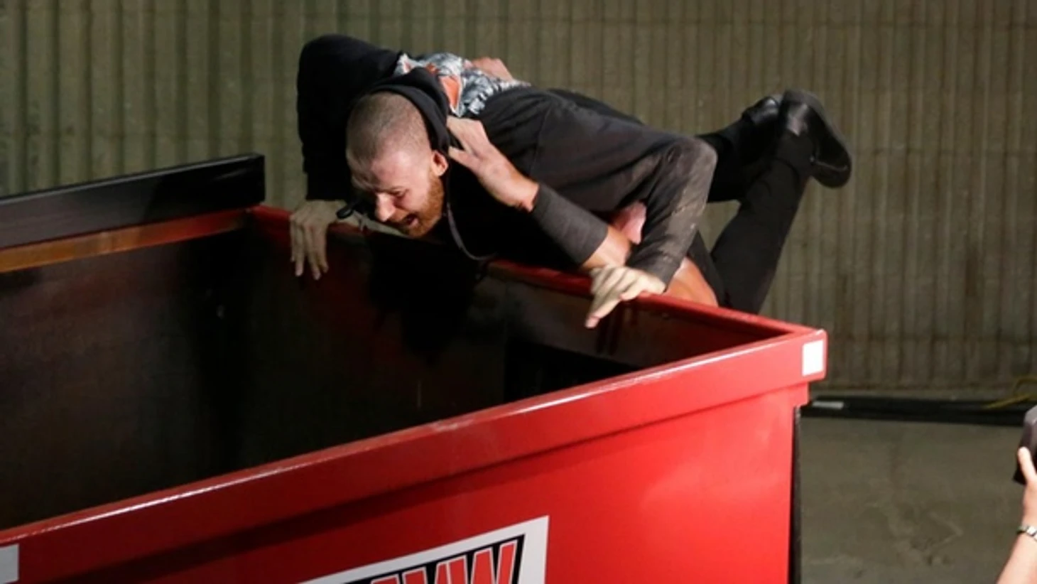 Сэми появился и спросил, на что сегодня собираются жаловаться фанаты. Они уже получили Романа Рейнса, матч Брайана и Кофи, и фанатам это, вроде бы, пришлось по вкусу. Да и Сэми это, на самом деле, понравилось, но тут есть 2 большие разницы. Ведь фанатам что-то нравится, но они все равно остаются собой. Они слишком привязаны к этому ничтожному человеку, кого они видят в зеркале, и им придется жить с этим до конца жизни. Ведь работать над собой сложно, а жаловаться намного легче (приблизительно на этом моменте Рене Янг без особого повода стала говорить что-то, Грэйвз ей стал отвечать, хорошо, хоть Сэми было слышно). Поэтому люди продолжат жаловаться, ведь это более легкий путь, и все они трусы. Сэми стал говорить, что уже представляет себе мнение критиков на следующее утро после RAW… и тут появился Брон Строумэн. Зейн же выкинул микрофон, снял кепку, куртку, сделав вид, что готов к драке, но на самом деле покинул ринг, и решил уйти через зрительский зал. Строумэн отправился за ним, Сэми ускорился — Брон тоже, в итоге это все превратилось в погоню, и через рампу парни убежали за кулисы. К рингу стали выходить Lucha House Party, а пока выходили их оппоненты джобберы, нам показали, как Зейн почти убежал от Брона, но тот его все-таки поймал и отпарвил в мусорный бак (как символично). Бак затем вытряхнули в мусоровоз и тот уехал (якобы на свалку).