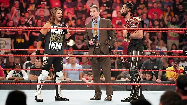 Открыл выпуск Винс МакМэн, который поприветствовал публику в Цинциннати. Он пообещал, что сегодня нас ждет RAW, которое никто никогда не забудет. Почему? Потому что открыл его Винсент Кеннеди МакМэн. И тут заиграла музыкальная тема Романа Рейнса, который не замедлил появиться. Публика встретила «Большого Пса», а босс, предупредив, что если Роман вновь решит провести ему Супермэн панч, полиция Цинциннати, присутствующая за кулисами, заберет его, задал вопрос, какого дьявола Рейнс делает на RAW, ведь он звезда SmackDown. Самоанец же предложил МакМэну следить за своим языком, и заявил, что он слишком долго был на RAW, чтобы с переходом на SmacDown взять и забыть место, которое было ему домом около 5 лет. Более того, Роман напомнил, что не так давно руководство заявило, что они больше не управляют WWE, теперь тут рулят фанаты, но они наврали, и все это время МакМэны руинили RAW, но теперь это закончено. Потому что Рейнс больше не подчиняется Винсу, теперь он подчиняется только Вселенной WWE, и если фанаты будут его поддерживать так, как сейчас (а его вполне активно чирили), то он готов появляться каждый понедельник. Глава WWE заявил, что этому не бывать, попытался развить мысль, но его прервал выход Дэниела Брайана. Винс и его спросил, что он тут делает, и Брайан завел речь о том, что его обокрали на WrestleMania, и все это время, зализывая раны, он думал о несправедливости жизни, так что когда он узнал, что Роман и Винс будут на RAW, он также решил появиться, чтобы интеллигентно поговорить с МакМэном. И тут под оглушительный чир толпы появился чемпион WWE Кофи Кингстон. Он обратился к Брайану, сообщив тому, что не обязательно бежать жаловаться к МакМэнам, если у Дэниела есть претензии на счет чемпионства Кофи, можно напрямую прийти к самому Кингстону и решить все. Услышав это, Брайан стал высказывать свои претензии, назвав Кофи человеком, который не заслужил чемпионства WWE, парни стали пререкаться, так что их Винс заткнул их, потому что у него есть мысль. Раз уж все перестали его слушаться, и звезды SmackDown стали появляться на RAW, как на счет того, чтобы ввести специальное правило — Wild Card Rule, которое позволит трем суперзвездам с одного бренда совершать появления на другом бренде. «Я чертов гений!» — подытожил Винс. Кингстон же решил пояснить свою позицию, он появился на RAW, потому что увидел твитты Романа и понял, что тот собрался появиться на красном бренде, и посчитал, что будет нечестно, если все веселье достанется Рейнсу. Тем более Кофи не особо занят на «Смэке» сейчас.
