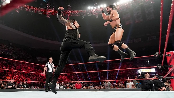 Начался матч с попыток завладеть преимущество МакИнтайром, но каждый раз Роман давал отпор. Коронные клоузлайны в углу начали проходить, но Дрю отбился оверхэд белли-ту-белли. Это позволило шотландцу завладеть преимуществом, прошел суплекс, но только до 2. Следующую минуту Дрю мучил соперника в захвате, но Рейнс отбился, чуть не поймал его на самоан дроп, и провел пару клоузлайнов, пока МакИнтайр не перекинул оппонента через себя еще раз. На рингсайде он впечатал Романа в стойку ринга, и, вернув в четырехугольника, попытался продолжить доминирования, но Роман перевел попытку суплекса соперника в собственный суплекс, отправив затем того клоузлайном за пределы ринга. Заход на drive by дропкик был встречен бутом, а затем МакИнтайр впечатал Романа в апрон реверс фоллэуэй слэмом. Когда мы вернулись с рекламы, Дрю перевел попытку супермэн панча в спайнбастер, но только до 2. Выход на Клэймор — неудачно, и рестлеры стали обмениваться ударами, а закончилось это, когда МакИнтайр провел свой хэдбатт, но только до 2. Попытка butterfy DDT от Дрю, но Роман реверсировал и поймал визави на собственный DDT, которого также для победы не хватило. Шотландец покинул ринг, Роман зашел на панч со ступенек, однако в ответ прилетел бут, и Дрю отправил его в ступеньки. Сайд слэм в ринге, но удержание опять лишь до 2. МакИнтайр забраля на третий канат и… влетел прямо в супермэн панч. 1, 2, нет. Попытка гарпуна, Дрю ее встретил ногой, пара реверсов, и Роман провел-таки гарпун. Удержание, но в ринг залетел Шэйн МакМэн, который принялся избивать Рейнса, за что судья дисквалифицировал МакИнтайра. О'Мэк продолжил избиение, но тут заиграла музыкальная тема Миза, и «A-Lister» побежал к рингу со стулом в руках, так что Шэйн просто сбежал через зрительский зал. Миз побежал за ним, а Элайас, который остался в ринге, подставил Романа под Claymore от МакИнтайра.