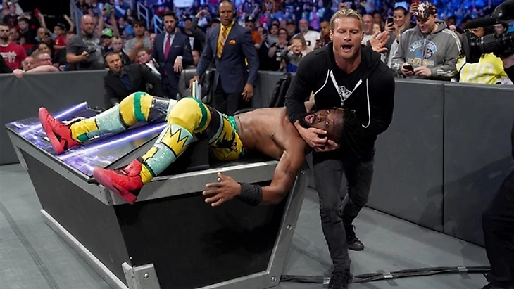 Не сильно хуже предыдущего матча, но времени ему явно не хватило. Опять же, исполнители могут гораздо больше, но их явно ограничивают. Возможно, всё так было обставлено, чтобы сделать послематчевое избиение более красочным. Что же касается его самого, то, во-первых, я рад возвращению Дольфа Зигглера и его пушу. Но очевидно, что это проходной соперник, не удивлюсь даже, если после WWE Super Show-Down он опять уйдёт в стенд-ап. А во-вторых, реакция толпы немного смазала впечатление, потому что её почти не было. Были какие-то «бу», но весьма сдержанные. Также стоит отметить, что Кофи сдержал своё слово «уйти на своих двоих». Не знаю, намеренно так было сделано или это совпадение.