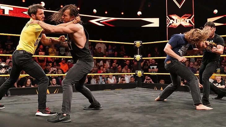 После переговоров между фейсами, начали бой О'Райли и Гаргано - с крепкого лок-апа и даже мат-рестлинга, особенно со стороны Кайла, у которого есть опыт. После паузы, которую взял Кайл для переговоров с Фишом, оба рестлера вновь возобновили мат-борьбу - она продлилась уже не так долго, ибо кросс-армбар О'Райли был быстро среверсирован в Gargano Escape. Его силы Кайл избежал, но получил другое - пару больших армдрагов, после чего сумел уйти с Джонни в свой угол и передать право избиения Бобби, который отважился на атаку Риддла - Мэтт ушёл и от первой атаки Фиша, и от захода Кайла, но всё-таки получил в голову со спины, правда и Гаргано не остался в стороне. Зрители прилично завелись, а Джонни передал тэг Риддлу - последний прилично отрывался на груди Фиша своими чопами, а затем и вовсе начал выносить обоих эровцев, завершив этот заход Exploder-суплексом. Разумеется Кайл поспешил на помощь товарищу.......и получил за это оверхэд-кик, но отвлечение в целом сработало - Бобби быстро пришёл в себя и сцепился в жёстком размене с Мэттом, в котором победил последний, начав проводить свой Guntrench-Suplex City (Брок Леснар следит за тобою, Мэттью. Берегись Зверя Во Плоти!). Но пришлось прервать - в атаку ринулся О'Райли, чем подставился под второй заход Guntrench-Suplex City, но до сих пор не до конца вылеченная спина дала о себе знать - этим и воспользовались reDragon. Они хорошенько прошлись по Риддлу, стараясь его ослабить до предела - сначала Фиш в одиночку попытался его удержать после избиения (мимо), а уже потом и командный суплекс от reDragon должен был окончить бой - не получилось. Вскоре Бобби начал действовать более медленно и концентрировано наносить удары, Риддл пытался отбиться - не получилось, так и вдобавок ещё прилетел slingshot-сентон - удержание только до 2. reDragon не останавливались в своей методике сдерживания Риддла от бегства в сторону Гаргано, но в итоге - Мэтту надоело это всё терпеть, и он сцепился в мощной борьбе против О'Райли. Помимо обычных ударов, те успели натворить несколько красивых реверсов между собой. Тем не менее - Мэтт сумел нейтрализовать Кайла своим коленом в голову и прорваться в свой угол - и тут главного чемпиона НХТ понесло во все тяжкие. Кик в Фиша, оверхэд белли-ту-белли суплекс на Кайле, пара чопов в обоих и под конец - running-фейсбастер на Бобби и running бут-кик в Кайла одновременно окончил эту красивую серию Гаргано. Далее чемпион НХТ решился на новый заход, но тут уже выходцы из ROH сумели правильно сориентироваться в своих силах и даже добились проведения Chasing The Dragon - но удержание только до 2, Гаргано пережил этот финишер.