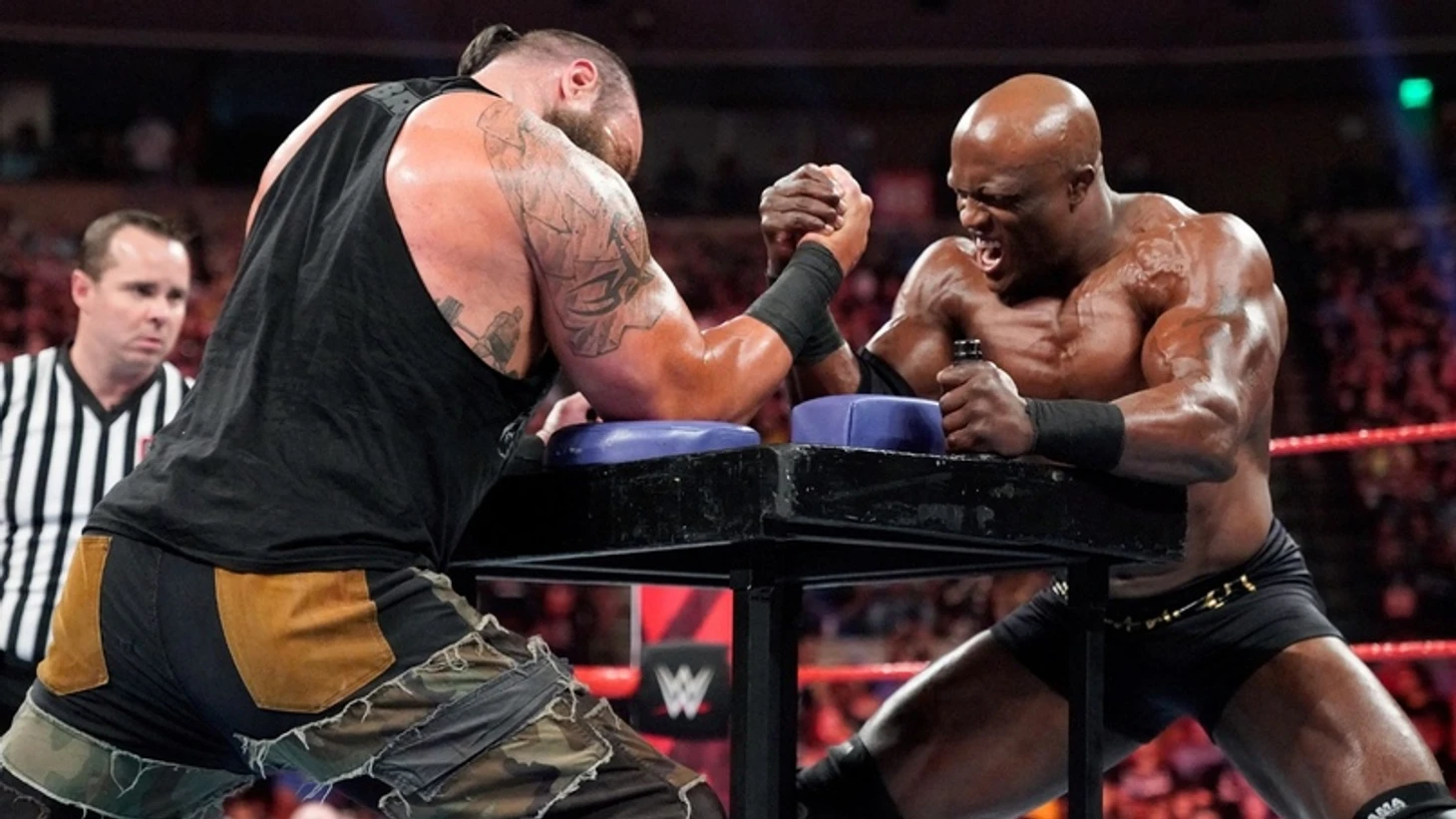 - Также нам показали скажем так традиционный арм-рестлинг матч между Броном Строуменом и Бобби Лэшли. По началу All Mighty пытался вывести Монстра среди людей на срыв этого состязания, но обоим рефери, не попав под огонь двух больших парней, удалось их успокоить и начать состязание. Первая попытка не удалась из-за.....вспотевших рук, возможно у обоих (с маслами что ли переборщили?). Вскоре они исправили это и пошли на второй заход - борьба была крайне тяжёлой, так как рестлеры показали мощную хватку и через полминуты победу одержал Строумен. Но Лэшли исход естественно не устроил и он атаковал Монстра (не без помощи предмета), под конец пригвоздив его в ринг.....финишером же Строумена, что выглядело очень мощно (Подводка к матчу несколько так себе, зато без премудростей и возможно с перспективой неплохого быстрого матча, учитывая гибкость Лэшли);