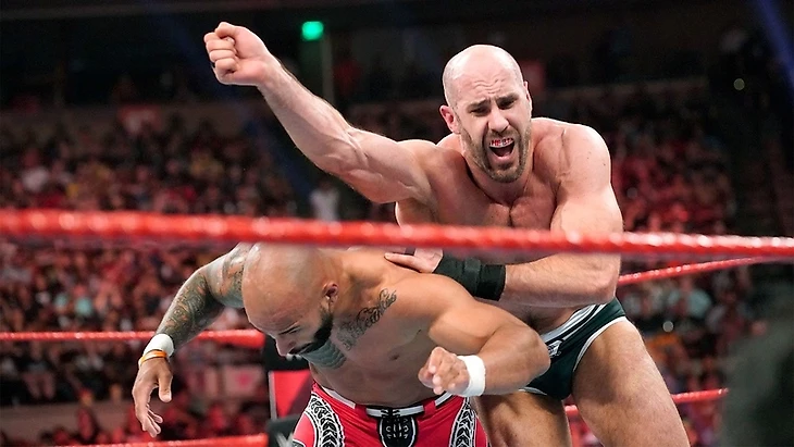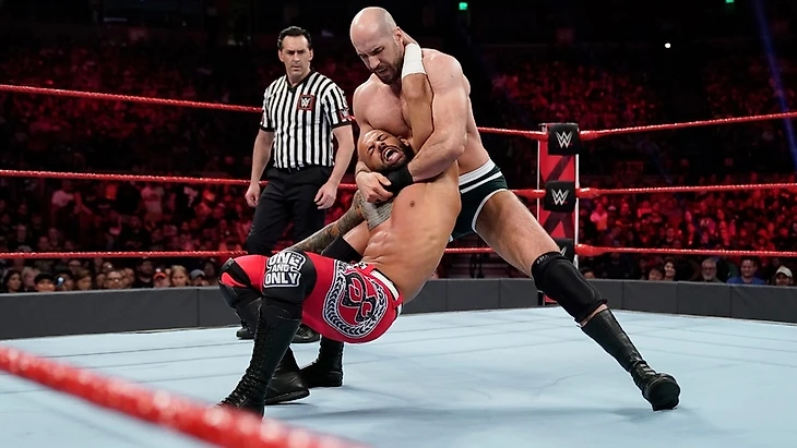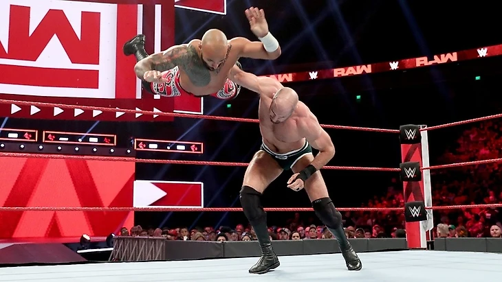 Начали рестлеры бой с резвого старта - Рикошет атаковал швейцарца и пытался провести хурикенрану. Сезаро перехватил оппонента и приготовился к бомбе, но Рико тут же отпрыгнул от него....чтобы получить шоулдер-блок. Также некогда швейцарский Супермен сумел не менее красиво перехватить атаку Рикошет и провести свой бекбрейкер - держание только до 2. Далее пошла доминация от бывшего многократного командного чемпиона WWE на новичке, особенно на силовом уровне - тем не менее бывший чемпион Северной Америки NXT USA сумел два раза контратаковать хурикенранами (на ринге и с баррикады), а после краткой стычки на рингсайде - провёл и мунсолт со второго каната. После рекламы рестлеры старались держать преимущество и реверсировали многие приёмы друг друга на ринге, отчего переместились в угол ринга - там борьба приняла весьма опасный характер. Рикошету удалось выловить Сезаро и пригвоздить его в тёрнбакл - это был шанс для того самого 630-сэнтона, однако европеец оказался крайне крепким орешком и выбил Рикошета связкой из апперкота и суперплекса (с апрона на ринг через канаты), удержание не прошло, что было весьма удивительно.