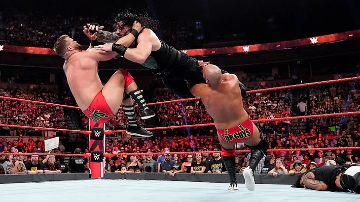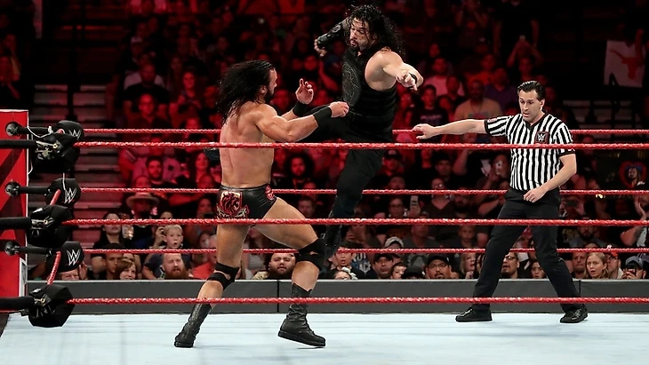 Выпуск был начат Романом Рейнсом, вышедшим на ринг. Однако начать рассуждать бывший 4-кратный мировой чемпион WWE не успел - его прервал "лучший в мире" Шейн Макмэн, который по традиции пофлексил и начал свой спич. Он заявил о своей готовности одолеть Биг Дога в эту пятницу, вспомнив о своих ярких моментах избиения Романа, чтобы просто добиться того самого момента, когда рефери отсчитает до 3 и будет объявлено об одном победителе....Тут Рейнс прервал Шейна и начал по сути провоцировать его на действия прямо сейчас, указывая на то, что на протяжении долгого времени Макмэн-младший шёл на любые ухищрения и подлости, но никогда не разрешал перечисленные Шейном моменты по честному, 1 на 1. А Рейнс готов идти против любого подсоса Шейна, так как ему всё равно через кого переступать. И вот тут.....появился Дрю Макинтайр, который сказал всем заткнуться и слушать то, что скажут он и "лучший в мире", а затем обратился к Роману - Дрю намерен расквитаться с Рейнсом и не видит лучшего места, чем Stomping Grounds (название нового PPV, если что). Но то дело грядущего, а на данный момент, предложив некую идею Шейну, он заявил, что запланированного командного матча не будет и они оба готовы разбираться с Романом. И естественно это был обман - The Revival ака Механики дождались своего момента и атаковали Романа, однако полноценного избиения не получилось - Усо также были готовы и своевременно отреагировали, очистив ринг от хилов. Слово за слово - и тут же матч был начат пришедшим разнимать стороны рефери.