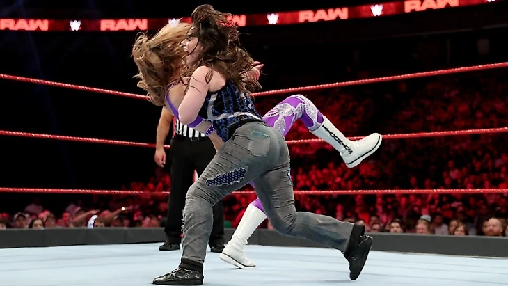 Начался матч с краткого курса по позёрству от женской командной чемпионки, что не понравилось Кросс, правда последняя словила spinning heel-кик. Далее Пейтон просто забивала Никки в углу, затем перебросила в другой и показала свою гибкость через corner foot-чок. Правда отвлечение Ройс от оппонентки чуть не кончилось для неё быстро и плохо - Кросс атаковала jawbreaker-ом и пыталась свернуть, но только до 2. Ройс ответила клоузлайном и также пыталась удержать - мимо, только до 2. Австралийка не остановилась и начала действовать более изощрённо - сначала дезориетировала коленом у канатов и далее с их же помощью заперла Кросс в своём фирменном armbar-стретче, хоть и ненадолго по решению рефери. Пейтон пыталась снова устроить забивание в углу - Никки стала сопротивляться, отчего Ройс фиксанула на оппонентке мощный болевой на руку (и даже показали чего стоила Кросс доминация от командной чемпионки - крови). Кросс снова начала уже сопротивляться и приготовилась ответить, но не сработало и чуть удержание не словила - благо только до 2. Пейтон быстро восстановила изначальное положение, однако также быстро и потеряла его - Никки наконец-то удалось отбиться с локтя и нанести несколько крепких панчей по Ройс, тем самым дезориентировав её в пространстве. Кросс не на шутку завелась и даже успешно провела running-бульдог, приготовясь к кроссбади - но австралийка ушла от атаки. И вот тут уже началось нечто забавное - Блисс в этот момент получила чашку кофе, Пейтон и Билли возмутились этому (с какого х..... только вот, если им это не мешало никоим образом) и конкретно поиздевались над Алексой. Это и стало критической ошибкой для Пейтон - она максимально отвлеклась от Никки, так ещё и разозлила последнюю, обидев Блисс - и тут же среверсировала атаку Ройс в свой коронный The Purge и удержала Пейтон до 3.