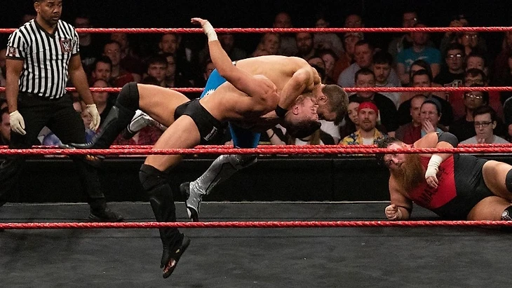 Я задолбался раз в полгода копаться в старых обзорах, дабы найти полные имена участников The Hunt, так что отныне буду называть их так, как называют все — просто по никнеймам. Примат и Хаксли начали бой, прошел обмен ударами, и Кабан сумел получить право ведения боя, ознаменовав то, что они с напарником завладели ранней инициативой. Сэкстон отбился Лу Тез прессом, и Ти-Боун получил тэг, чтобы потоптать визави. Какое-то время Тайсон и Сэкстон мучили бедного Кабана, тот даже гатренч суплекс от Ти-Боуна получил, но сумел вырваться из удержания. Пострадав ещё какое-то время, отбился от соперников и передал тэг Примату. Тот понёсся своими атаками на Хаксли, Дикий Кабан тем временем обработал Тайсона, а в итоге Сэкстон получил поп-ап немецкий суплекс. Хэдбатты с третьих канатов от The Hunt, и это победа. Празднование, правда, длилось недолго, ибо в ринг подоспели Вольфганг и Марк Коффи, уничтожившие победителей.