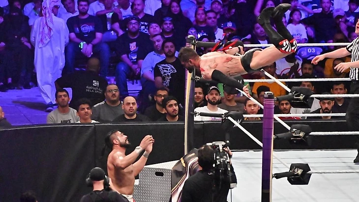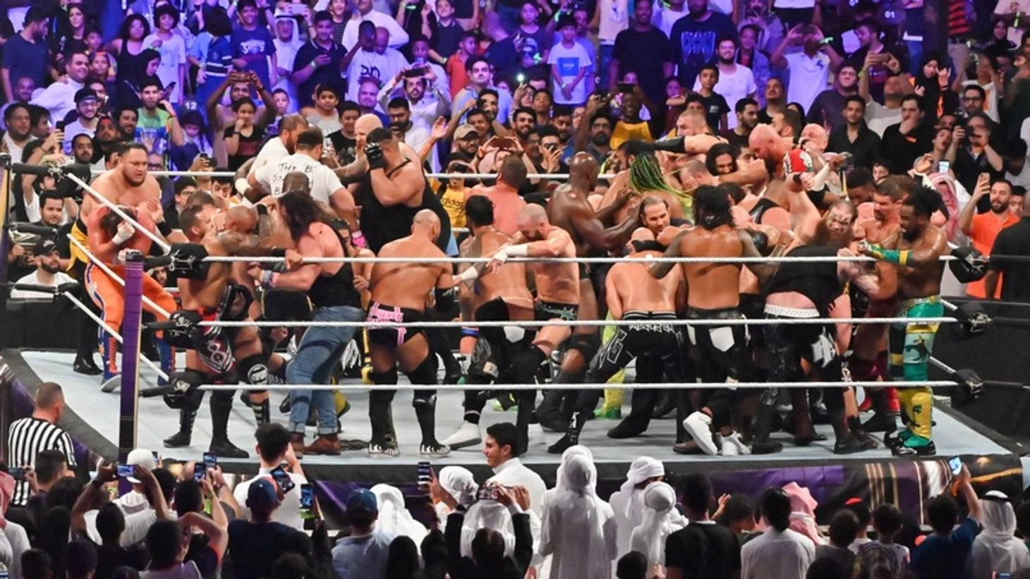Честно, я не считал, было ли на ринге 50 человек, но, на самом деле, целая толпа вышла вместе, и только Миз, Сезаро, Джо, Тайтус и Элайас получили индивидуальные выходы. Причем Элайас вышел и спел песню под гитару о своих соперниках, причем на этот раз с акустической гитарой. Тайтус же обыграл свой выход годичной давности, когда он упал. Миз атаковал Элайаса еще до того, как он вошел в ринг, и бой начался. Тут же мы попрощались с братьями Сингх, ИСи3, Янгом, Каррийо, Лорканом, Слэйтором, Андерсоном, Гэллоузом, Акселем, Тозавой, Далласом, Ноу Уэй Хосе, Моджо Роули, Кендриком, Гулаком, Низом, Такером Найтом, Эйкемом и Резаром. Тайтус выбрался из под ринга, атаковал Эрика и Айвара, которые неплохо так справлялись со уничтожением соперников, и выбил их по очереди. Тут же и Тайтуса выбили из боя, а затем и Мерфи. Шелтон Бенджамин получил Twist Of Fate на апроне от Мэтта Харди, и был таков. Хоукинс и Райдер пали жертвой Джо, а затем вылетели Гейбл, Крюс и Махал. Много неразберихи было на ринге, но одним из ярких моментов стала «гусеница» от Отиса, с двойным элбоу дропом, но тут же он был выбит Роуэном, как и Вудс. Затем мы попрощались с обоими Усо, а Доусон и Уайлдер получили по Twist оf Fate вылетили от рук Мэтта Харди. Затем был элиминирован сам Мэтт, а Сезаро зашел на swing Седрику Александру, после чего и выкинул его через верхний канат. Настала минута славы для Син Калы, который затем сумел элиминировать Накамуру, но его выбил Русев. Русев же улетел после стараний Миза, равно как и Руд. Затем Сезаро попробовал элиминировать Миза, но не прошло, и Майк вышел на IT кики швейцарцу и Элайасу, который позже и выбил Миза своим коленом. Финальная шестерка: Мансур, Али, Рикошет, Самоа, Сезаро и Элайас. Все разбились по парам, Джо неплохо справлялся с оппонентами, но Рикошет и Али выкинули чем-то вроде суплекса с апрона. Тут же двух хайфлайеров элиминировал Сезаро, а его, в свою очередь, выбил Мансур. В финальной двойке остались Мансур и Элайас, музыкант попробовал выбить аравийца, но тот поймал гитариста супелкиком, и перекинул через третий канат. Мансур выиграл самый большой баттл-роял в истории у себя на родине. После шоу он дал небольшое интервью, в котором вспомнил, что год назад его на этой же арене представили, как новичка WWE, а в этот день он одержал победу в таком важном матче. Теперь его мечта стала его жизнью: он является звездой WWE и представляет свою страну по всему миру.