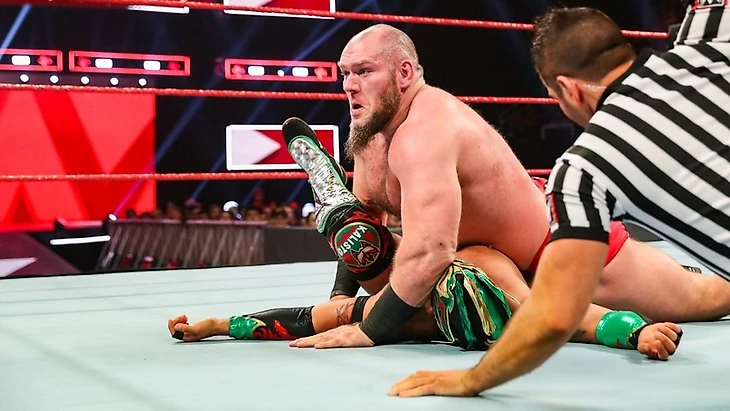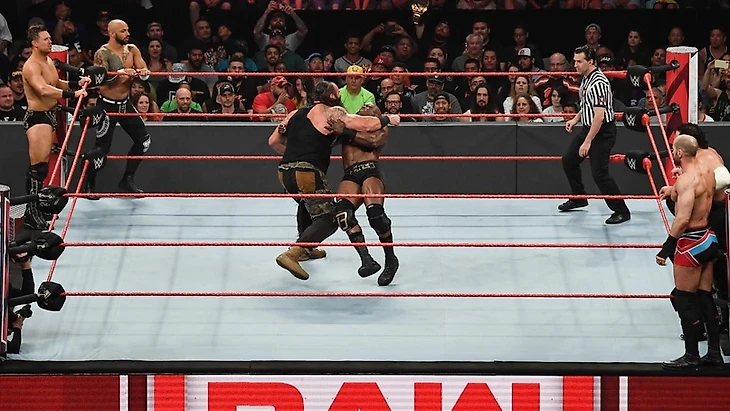 Попытка пауэрслэма чемпиону Соединенных Штатов, но тот ушел от этого дела и покинул арену со своим титулом. Брон попробовал его догнать, но Бобби влетел в него гарпуном. Тут же Миз отправил Рикошета в полет на Лэшли. Апперкот от Сезаро Майку, но только до 2,8 (прекрасный нирфолл). Попытка Neutralizer, но Миз перевел ее в Skull Crushing Finale, передал тэг Рикошету, и сплэш в 640 градусов поставил точку в этом матче. Победа Брона, Миза и Рикошета. Сезаро после матча, кстати, либо очень хорошо селлил ноги, либо Рикошет ему повредил их своим сплэшем, ибо приземлился он именно на ноги швейцарца.