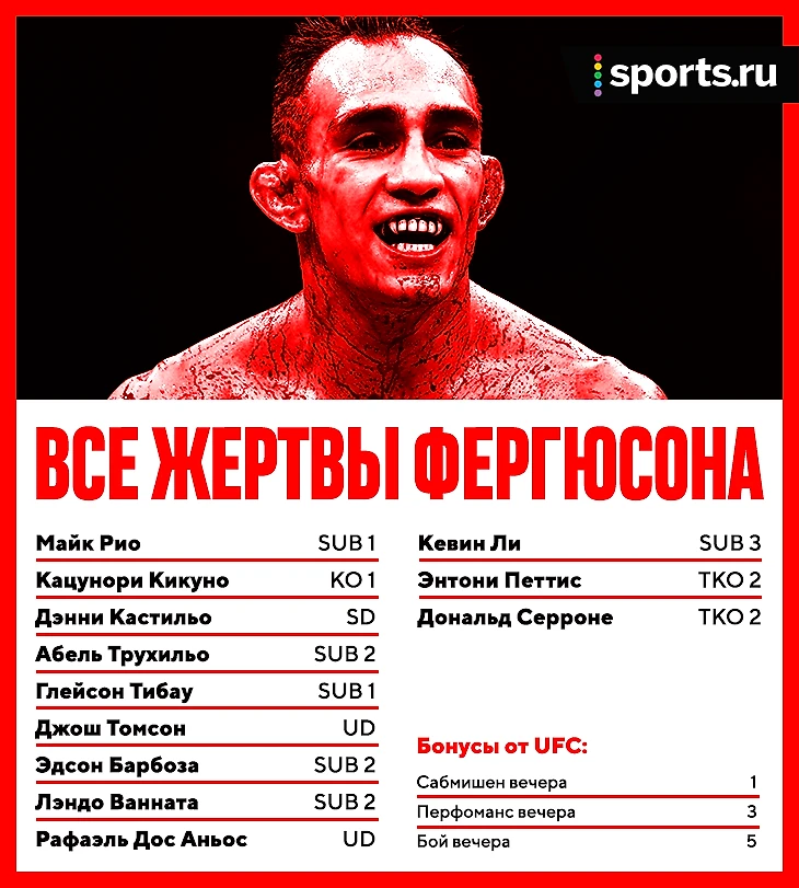Фергюсон прорвался в UFC в 2011-м через шоу The Ultimate Fighter – и это был один из самых ярких перфомансов в истории реалити. Тони вырубил всех четырех соперников – три нокаута в первом раунде.
