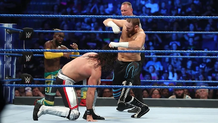 Командный матч 2 из 3 фоллов – Кофи Кингстон и Сет Роллинс против Сэми Зейна и Кевина Оуэнса.