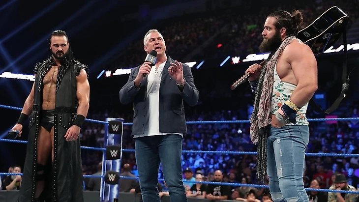 На ринг выходят хорошо знакомая троица – Шейн МакМэн, Элайас и Дрю МакИнтайр. Шейн не просит в этот раз анонсировать. Также он не хочет говорить о том, что случилось вчера и хочет уделить всё внимание МакИнтайру. Тот заявляет, что ещё нисходительно отнесётся к своему оппоненту на Stomping Grounds, ведь Шейн попросил его окончить карьеру Романа, но Дрю решил, что выше этого, что он лучше Рейнса, который совершил подлую атаку на их VIP-ложу прошлой ночью. На PPV он хочет лучшего Биг Дога, но тут его речь перебивает Миз. Он показывает нарезку избиения Шейна, а затем её же в слоумо, посчитав, что это смешнее. Миз хотел было запустить ещё одну, но МакМэн сказал, что если это произойдёт, отвечающие за видео-аппаратуру будут уволены. A-Lister переходит к тому, что Шейн виноват, что происходит со SmackDown. Когда-то, став комиссионером, он объявил это место «землёй возможностей». Однако сейчас их получают только его дружки. И Миз считает, что это несёт ответственность за это, ведь из-за его травмы О'Мак выиграл турнир и стал лучшим в мире. Поэтому именно он завершит этот эгоистический трип. МакМэн отвечает тем, что лишь завершил то, что Миз не смог и не смог бы. И раз тот хочет всё закончить, то предлагает ему командный матч: Дрю МакИнтайр и Элайас против Миза и любого партнёра, который тот найдёт… ща 10 секунд. И пока шёл отсчёт у ринга появился Р-Труф, которого Миз и выбрал своим партнёром, объявив возвращение Awesome Truth. Но Шейн добавил ещё одно условие – это будет матч с элиминациями.