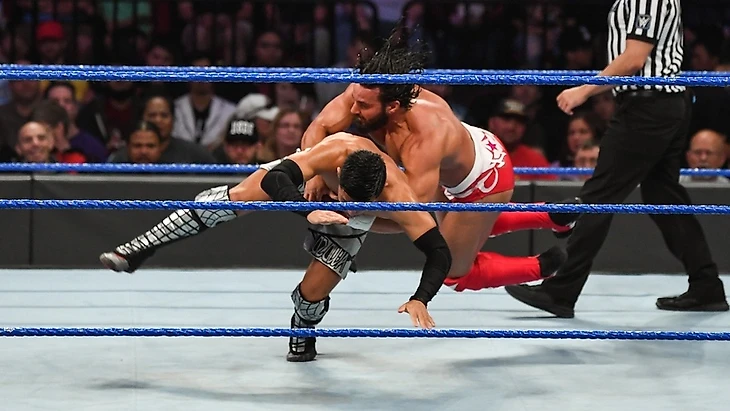 Это стало возможностью для Тони перейти в наступление - начался быстрый ударный размен между оппонентами в пространстве ринга и не только, в котором Тони со второй попытки удачно атаковал Тозаву Triangle Springboard-мунсолтом, но и тут - удержание только до 2. Рестлеры пришли в себя и начали раздавать друг другу опасные чопы, переводя их в свои основные ударные панчи, но тут именно Акира эффектно выловил Тони на энзигири и начал выходить на позицию для того самого удара - для своего финишера. Но не тут-то было - Низ пришёл в себя, и пошла крайней опасная борьба между рестлерами в углу ринга. Акира начал выходить на sunset-flip пауэрбомбу, только вот и Тони оказался не таким простаком - он избежал полной связки приёма и приготовился влепить alabama-слэмом. И вот именно здесь Тозава моментально среверсировал и провёл Низу Canadian Destroyer!!! Зрители были в полном шоке (как и я впрочем - такой реверс в WWE редко увидишь), а Тозава не ловит мух в небе и быстро начинает выходить на diving-сэнтон - промашка, так как Тони буквально за секунду ушёл с линии атаки. Обоим рестлерами после таких комбинаций и разменов было очень трудно, но они и не думали расслабляться - началась серия сворачиваний и ударных приёмов ради одного и того самого заветного пинфола, один из которых сорвался именно у Тони из-за ноги Тозавы на канате. Здесь Низ увидел возможность и разбежался для The Running Kneese, но Акира моментально среверсировал в суплекс - удержание только до 2. Японец начал идти в ответную атаку - оппонент выловил его связкой кика в корпус и бакл-суплекса в угол ринга, а затем снова попытался выйти на The Running Kneese, но Тозава снова быстро ушёл из-под финишера Тони и попытался загасить оппонента комбинацией киков - ему отчасти удалось это сделать, но Тони сумел выстоять против этого напора и, выловив Тозаву, мистер "Идеальный Атлет" провёл жесточайший Inverted Piledriver и удержал Акиру Тозаву до 3. Тони Низ - первый претендент на чемпионство 205 Live и участник титульного поединка на Extreme Rules.