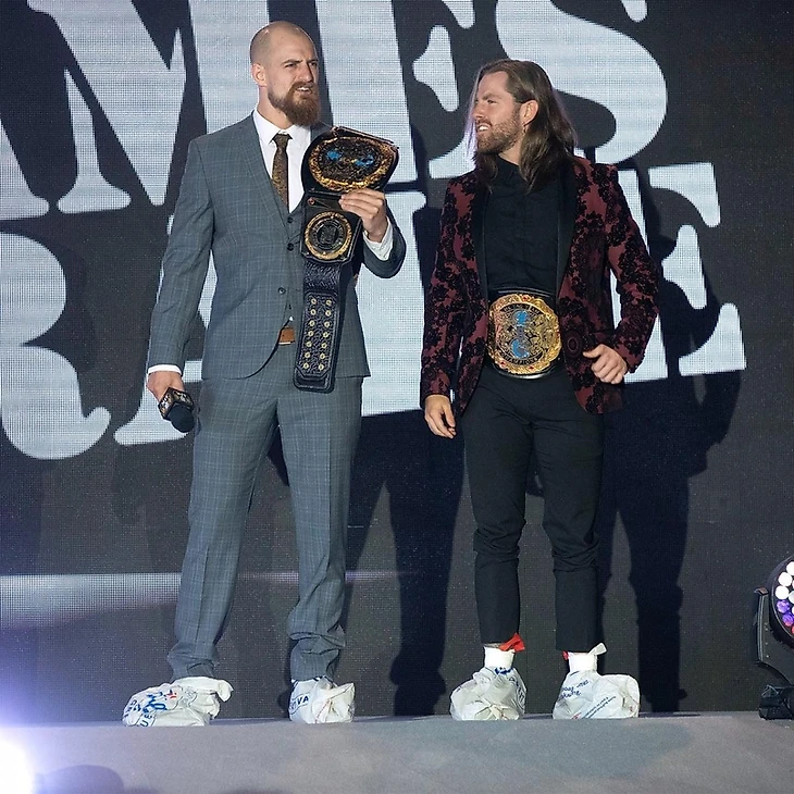 Возвращаемся на арену, где нас встречают вышедшие на рампу Командные Чемпионы NXT UK, которым, если я не ошибаюсь, уже через неделю предстоит защищать свои титулы в реванше с Moustache Mountain. В начале Зак Гибсон снова посетовал на то, что по прихоти Джонни Сэйнта их с Джеймсом Дрейком вынудили ехать в какую-то грязную дыру и выступать перед толпой потных варваров, и развивал тему неотесанности зрителей, далее он прошелся по музыкальному вкусу присутствующих, назвав исполняемую на фестивале музыку шумом и бессмыслицей, и подытожил тем, что они не пробудут здесь ни секундой дольше, чем им полагается. Наконец, речь зашла о защите титулов против Усатой Эры, цели пребывания Grizzled Young Veterans здесь. Они согласны на матч, но до той поры они останутся в своем номере в пятизведочном отеле, где будут наслаждаться жизнью. Ну и без ssssssooooon to be recognized от скауза не обошлось. Очередное шикарное хильское промо от Гибсона, уроженец Ливерпуля продолжает доказывать, что он – гений импровизации. Что же до боя с усачами, то его невозможно не ждать, если вы видели их стычку на NXT TakeOver: Blackpool в январе.